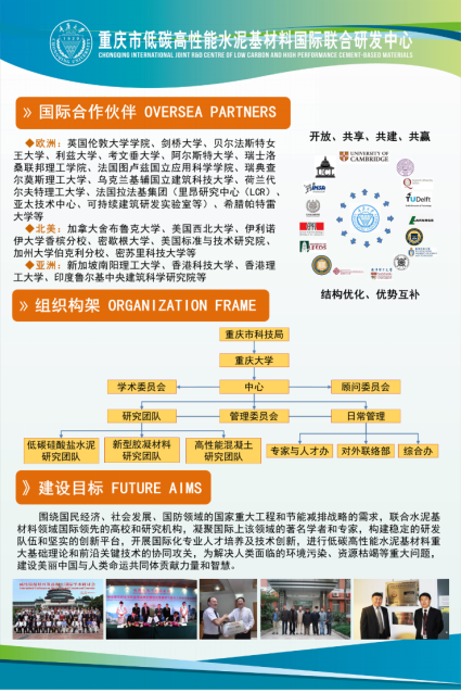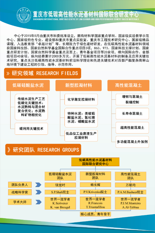 The Center was established in May 2015 approved by Chongqing Science & Technology Commission, with material science as key national disciplines, the national experimental teaching demonstration center, specialties of national professional characteristics, key laboratory sponsored by the Ministry of Construction of China and Chongqing municipality, Chongqing engineering technology research center, chosen as national excellent courses in the "excellence plan" by the Ministry of Education of China. The Center has engaged in long-term commitment to research and development of green building materials, undertaken three key projects in the field of low carbon high performance cement-based materials by state Ministry of Science and Technology, more than 20 research items sponsored by international cooperation of national natural science foundation, 863, 973, national science and technology support plan, the national key research and development plan, the national natural science foundation of key projects, youth fund projects. The Center has also conducted more than 40 projects of provincial scale and of horizontal international cooperation, with direct funds worth more than RMB 20 million yuan, has carried out research on low carbon preparation and application of key technologies for high performance cement-based materials,focused on scientific frontier theory of low carbon high performance cement-based materials and played a leading, guiding and exemplary role in key technology of construction engineering projects under harsh complex alpine mountain environment in the Western parts of China.