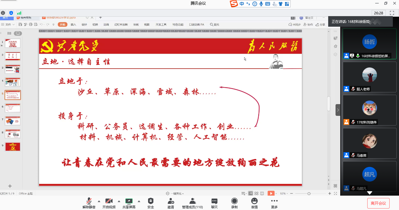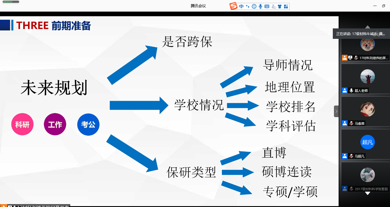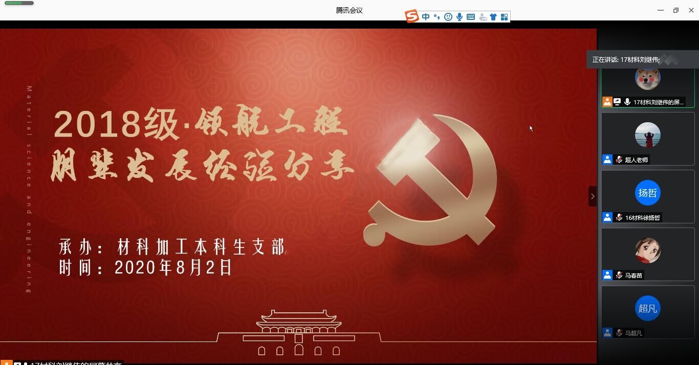 大二到大三是本科学习阶段重要的分水岭,为了帮助2018级的同学们开阔视野、明确发展方向,2020年8月2日晚七点整,由2018级辅导员任超老师牵头,公司材科加工本科生支部承办的“2018级领航工程·朋辈发展经验分享会” 线上活动如期举行。本次分享会特邀7位2016级已毕业的师兄师姐分享其保研、考研、留学、工作等各个发展方向的相关经验,邀请到4位刚经历了保研夏令营的支部优秀党员做相关交流。约有120多名公司2018级本科生通过腾讯会议app平台参与了此次分享会。