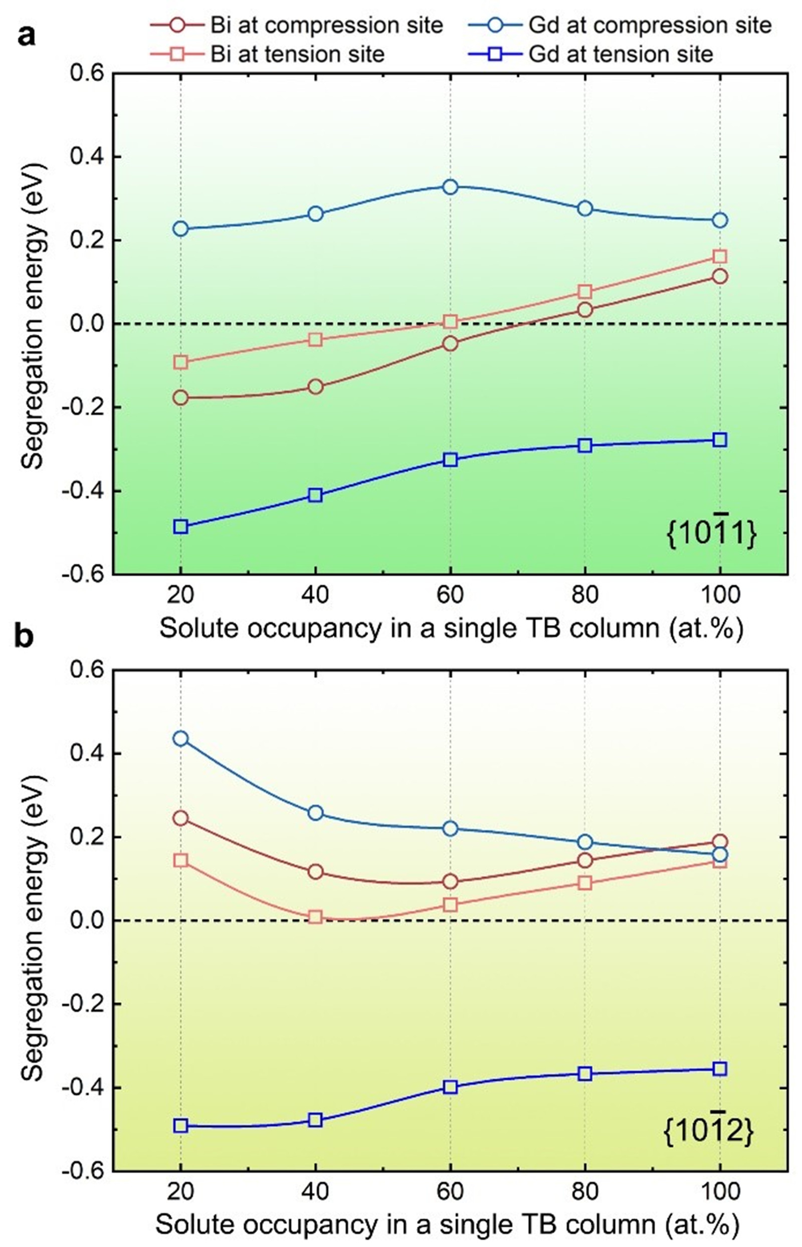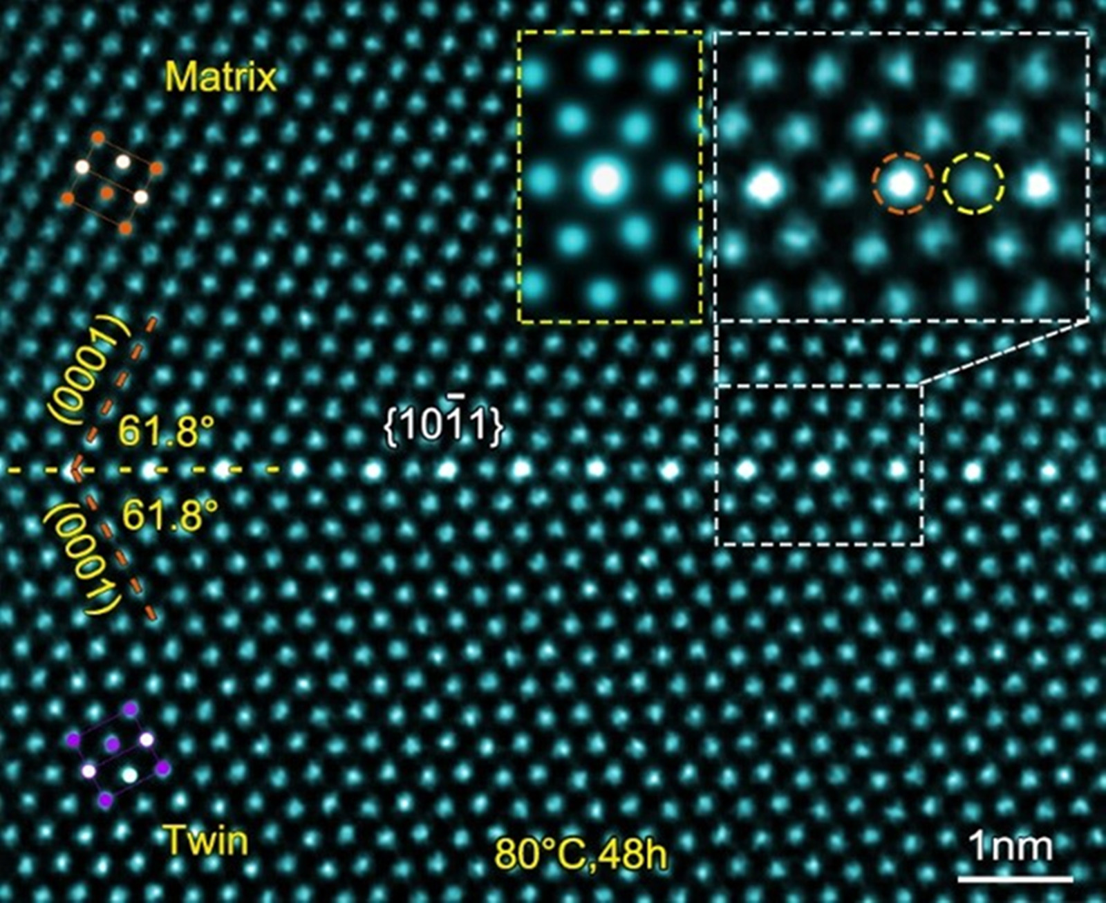 溶质原子界面偏聚对材料的性能有重要的影响。在过去十多年,金属材料中溶质原子界面偏聚行为研究一直是领域热点。目前公认的观点是,在镁合金中,原子半径比Mg大的溶质原子总是偏聚在共格孪晶界的受拉位置,而原子半径比Mg小的溶质原子总是偏聚在共格孪晶界的受压位置,从而使得降低孪晶界上的应变场。应变能最小化这一判据也成功地解释了后续在一些二元甚至三元镁合金中所报道的溶质原子共格孪晶界偏聚现象。