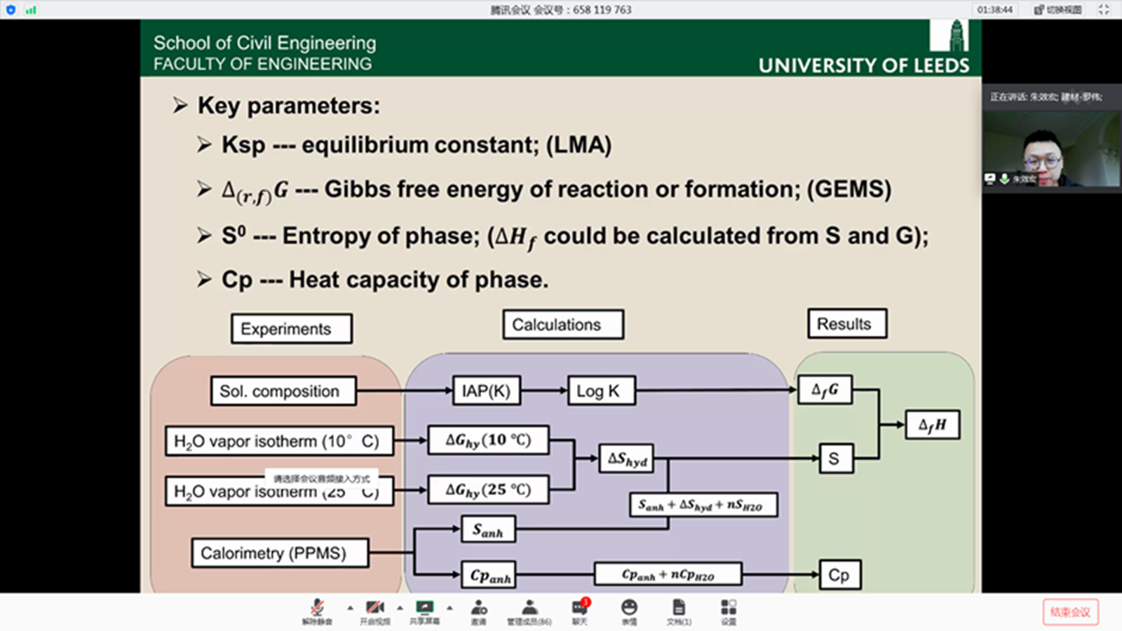 最后朱博士提出,水泥体系中固相与液相间的热力学平衡可以反应水泥基材料在水化过程中的物相演变过程,通过对水化过程中液相组成的分析,可以推测其固相中可能存在的无法被常规手段检测或表征的物相。