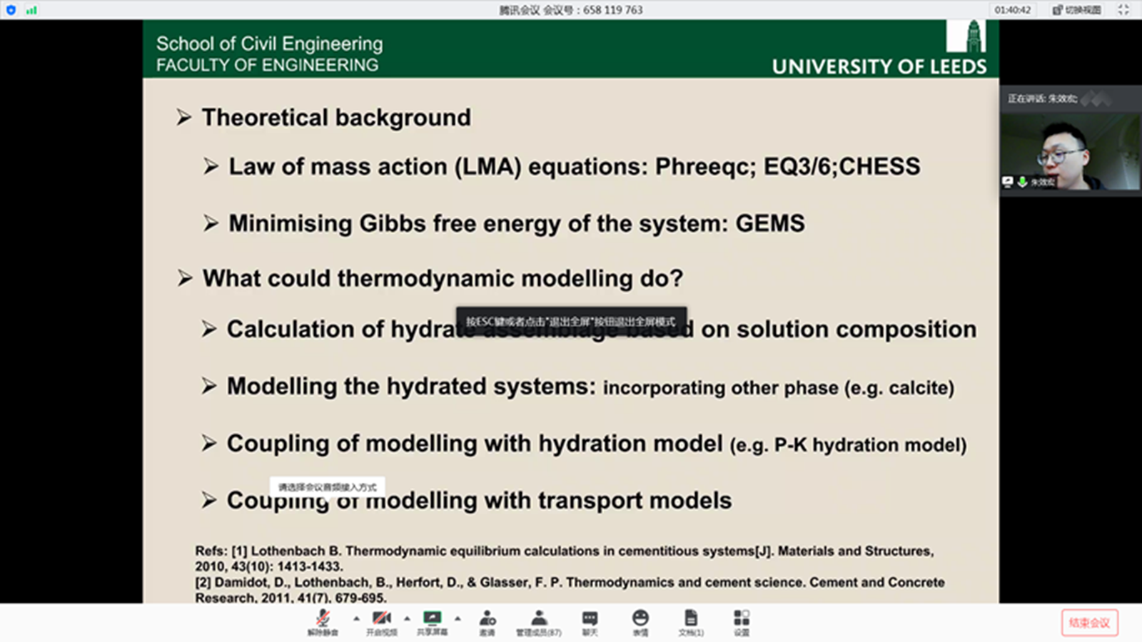 本次讲座以“Thermodynamic Equilibrium in Cementitious Systems: Applications from Aqueous Compositions Point of View”为主题,在讲座正式开始前,朱博士对自己目前的研究方向做了简单介绍,并对建材系王冲老师的诚挚邀请表示感谢,随后对今天的主要内容进行了大致的介绍。