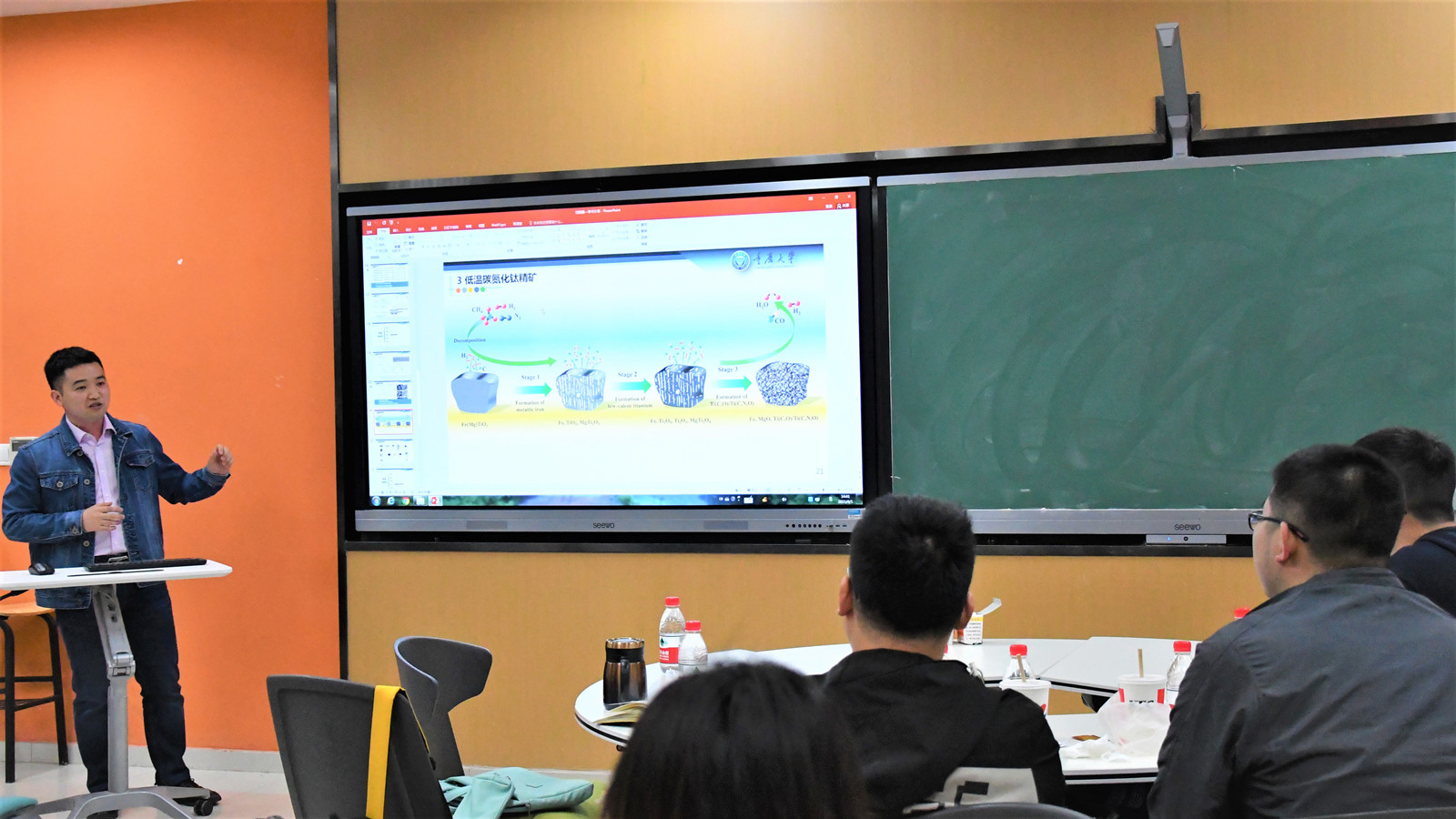 最后是由2017级博士研究生范刚强汇报《氢冶金在低温提钛中的应用》。目前,绿色发展水平与生态环境需求不匹配使钢铁产业面临巨大的减排压力。基于此研究背景,范刚强介绍了碳氮化钛的性质与用途,提出了一种基于氢冶金的提钛新工艺,并设计了完整的综合利用流程,然后重点介绍了低温碳氮化TiO2、钛精矿和含钛高炉渣的一些优化工艺。最后,他认为氢冶金工艺是一种大趋势,同时要注意低成本制氢是前提,高效氢冶金技术是关键,氢能综合利用是目标。