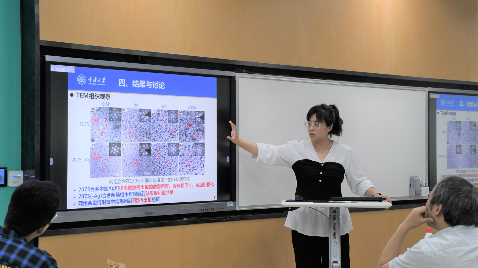 王一唱作了《Ag微合金化对7075铝合金时效析出行为的影响》为题的报告。她以Al-Zn-Mg-Cu合金的应用介绍开始,讲到微合金化是目前最为有效的提高合金综合性能的方法之一。又以7075铝合金通过加入微量合金Ag,经过时效、热轧、固溶等处理方法后,利用3DAP、TEM分析时效各阶段析出相的形貌、分布及成分。主要观察了三个主要方面:一是Ag对时效析出的促进作用;二是Ag对析出相及分布的影响;三是时效过程中析出相的演变。以上工作是为了确定析出序列及相演变规律,进一步建立高强度、高热稳定性7075铝合金的调控机制。