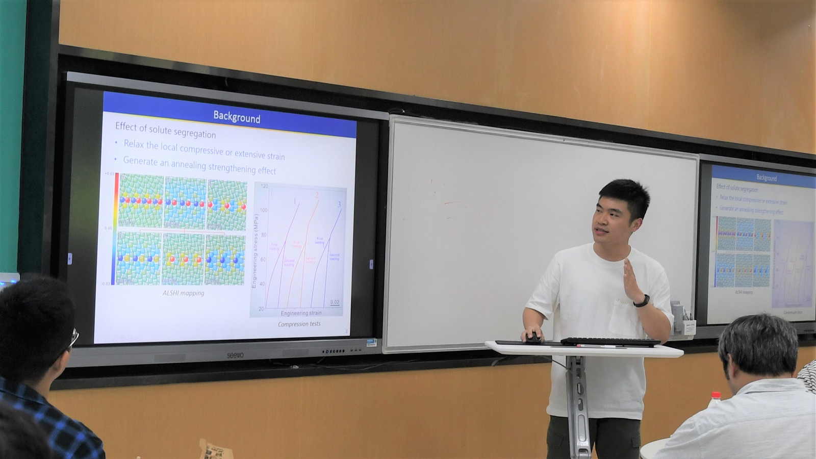厉志乔作了《镁合金中共格孪晶界的异常溶质偏聚现象》为题的报告。他以先辈们在研究Mg-Gd双合金开场,讲解Mg-Gd双合金能看到周期性的原子偏聚,原子偏聚是连续的,但又有一些不同的明暗区别。而当自己在做研究时,使用Mg-Bi合金进行时,能看到共格孪晶界,中心偏聚未见。为了进一步排除实验条件影响,为了使Bi更好地扩散,又进行了长时间的退火,依然未观察到偏聚现象。{10-11}现象与先前的观察相反,他留意了该现象,并使用第一性原理进行了计算,做了相关实验进行验证。