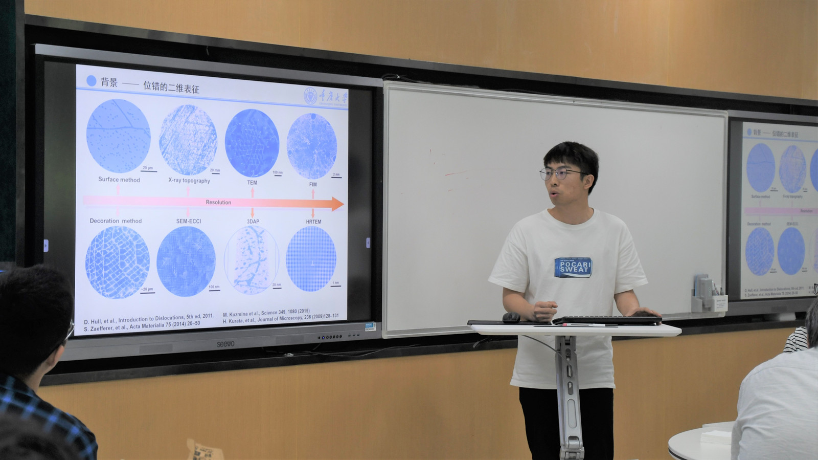 符锐作了《基于TEM的位错三维表征技术及其应用》为题的报告。他先是以位错的二维表征作为背景,并用生活中的错位拍摄并不能展示的事物全貌作为例子,讲到使用三维位错晶体学的必要性,并讲解了三维位错晶体学的原理。接着以Al-4.5Cu-1.5Mg合金中的位错界面重构为例,将晶面分割,得到每个单元节点坐标,经过坐标转换,进而定量表征晶面参数。在三维位错晶体学的应用时可以对任意单根或多跟位错定量分析,展示了当前他的研究中一些三维重构位错后的动画示意图,给与了相关的解释和看法。