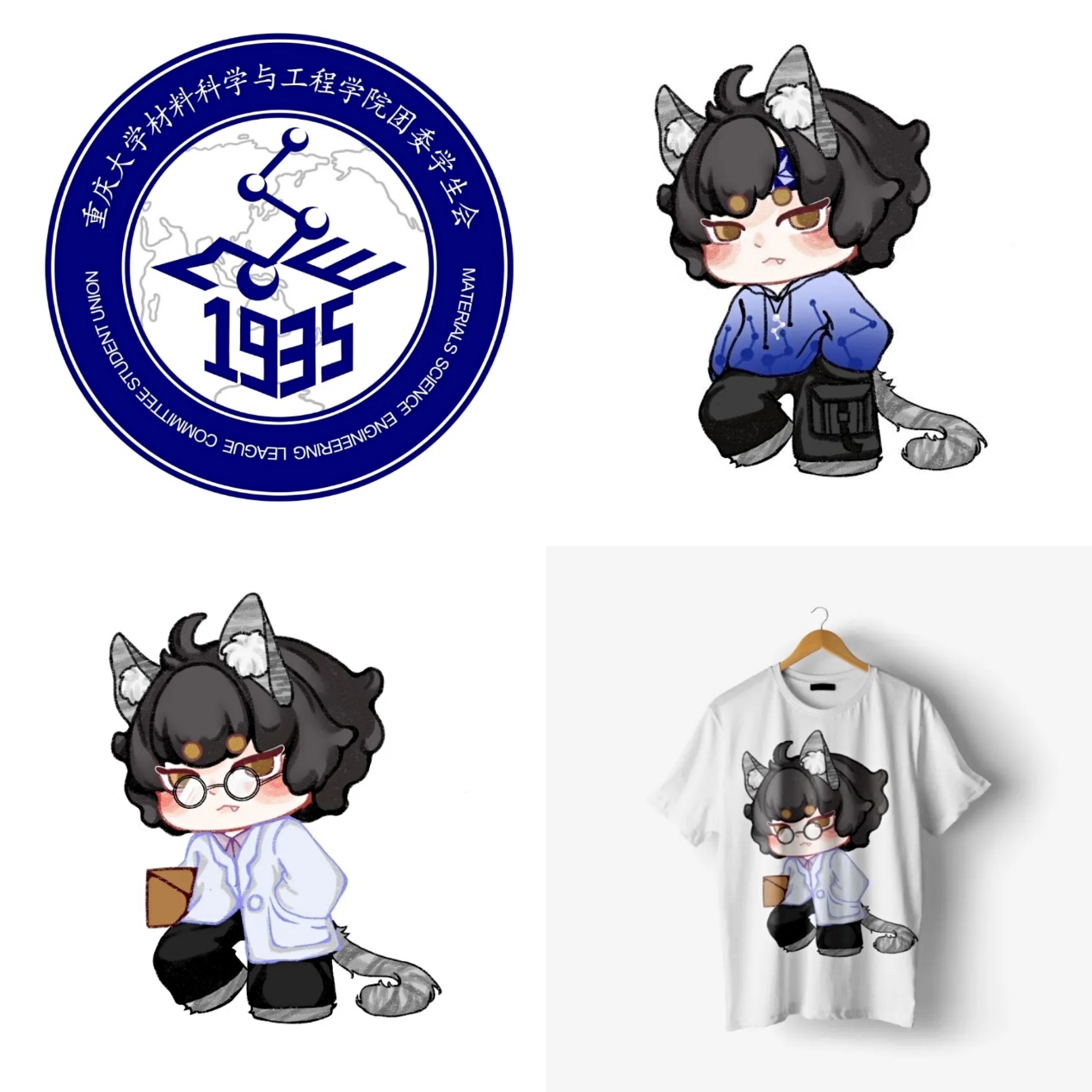 最终,来自微电子与通信学院的黎华月小队同时获得双赛道一等奖。他们的文字LOGO设计以蓝色为主,象征着科技;以“Material Science Engineering”的缩写“MSE”、学院创立时间“1935”和“材料”为核心理念,创造出“打开宝箱,发现并开发材料”的意象,蕴含着理性、宁静、深邃等团学所具有的品质。他们的卡通形象设计以“猫”为形态主体,以材料结构形状的饰品为点缀,设计出代表团学的工作和生活两种状态:工作时形象它头戴眼镜,手夹文件夹,扣紧的白大褂体现了一丝不苟,严肃认真之意;生活中,它身着蓝色渐变卫衣和黑色工装裤,体现出严谨的生活态度。