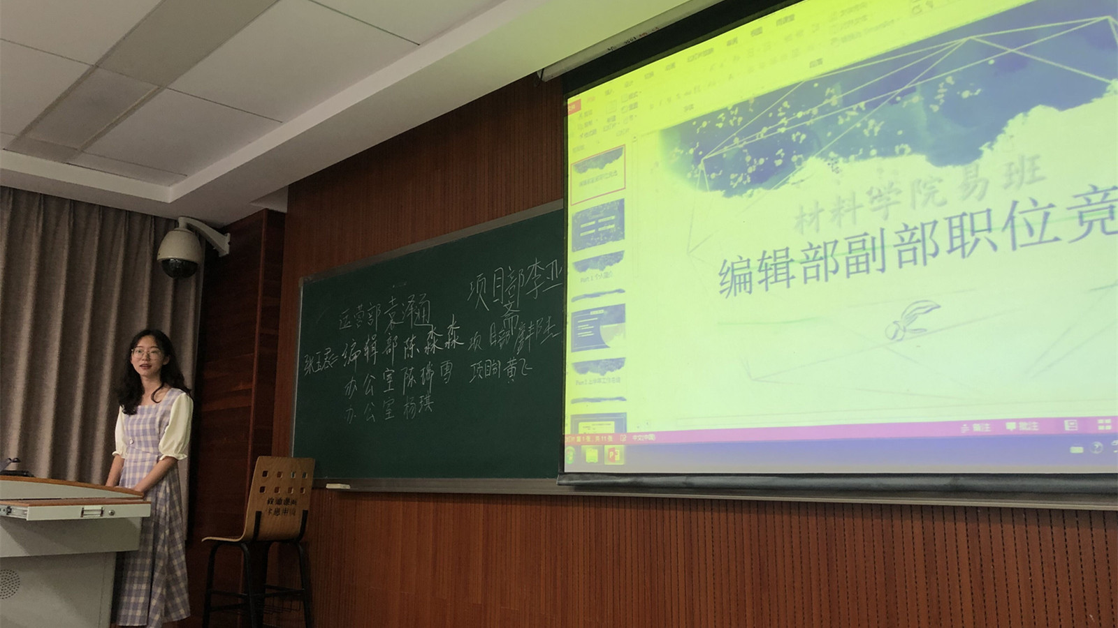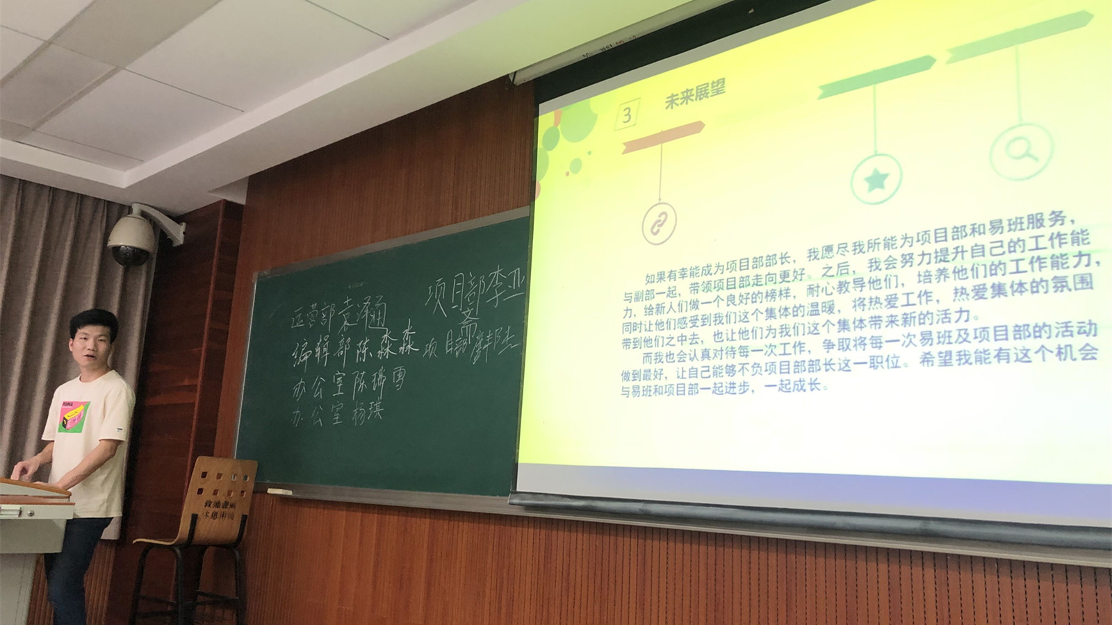 会议伊始,由19级材料易班站长苏浩文做工作汇报。他对上一年材料易班的工作做了较为全面的总结,分析了工作中的得与失;然后他就换届竞选流程做了说明,鼓励台下同学走上台来参与竞选陈述。