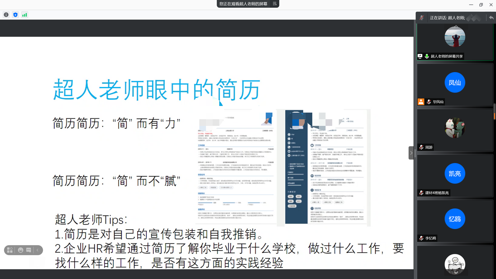 接下来,任超为同学们分享了如何制作一份优秀的简历。他指出,简历是对自己的宣传包装,也是自我推销的名片。简历应该达到”简”而有”力”,”简”而不”腻”的效果。针对应聘的不同岗位应该制作不同的简历,要努力将岗位需求关键词融入到自己的简历中,多采用量化的形式,展现出自己的核心竞争力,快速有效抓住HR的眼球。
