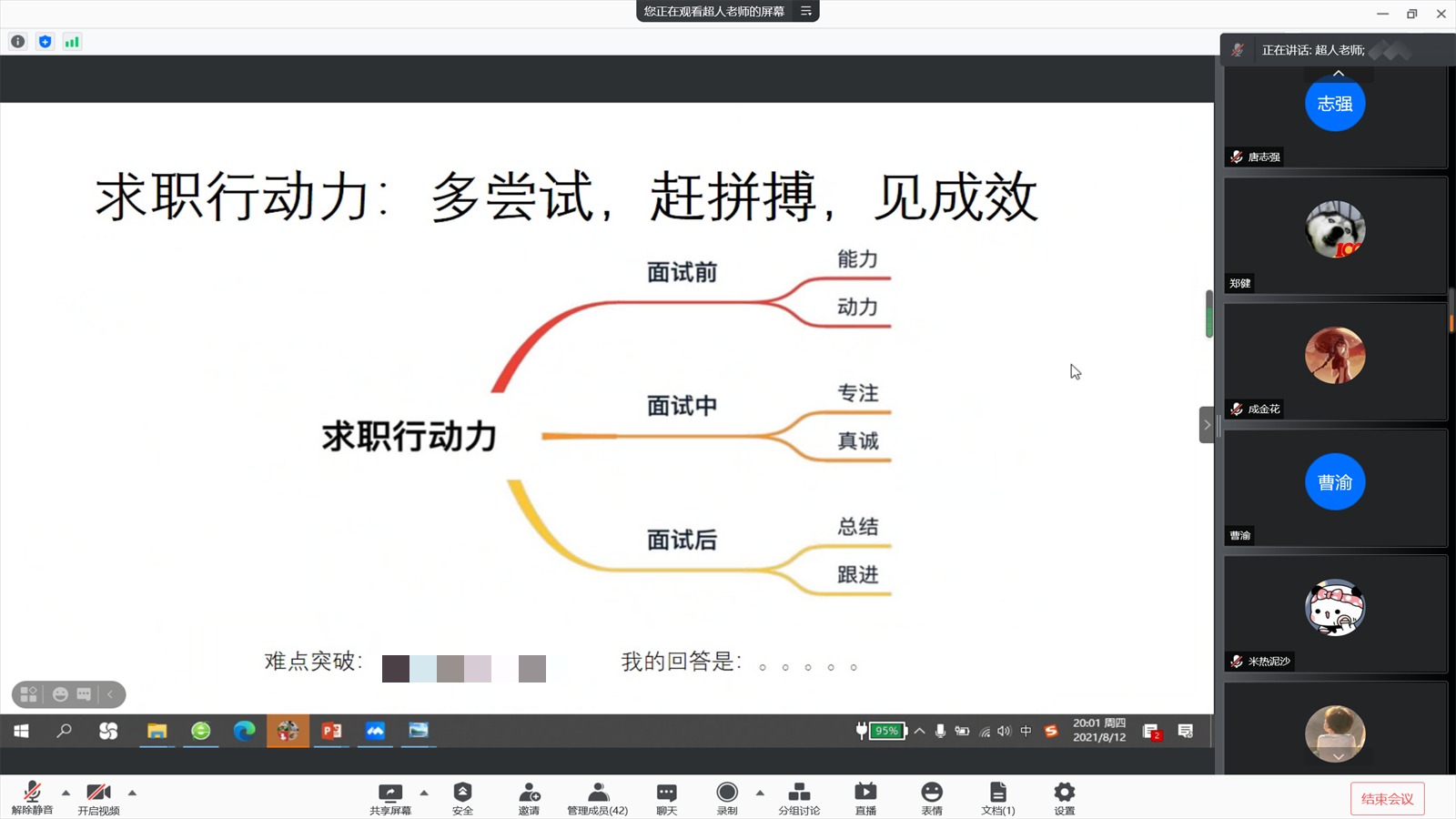 分享结束后,同学们踊跃提问,任老师耐心解答,主动传授面试经验。此次活动不仅使同学们对就业形势有了更加深刻的认识,同时也为他们提供了宝贵的简历制作及面试经验,为即将开始的秋季招聘打下了良好的基础。