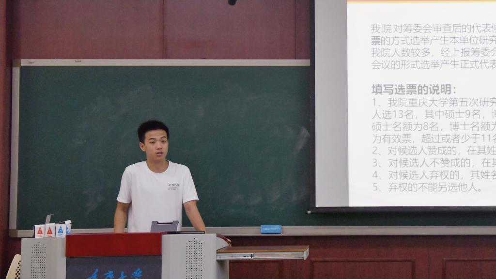 本次代表选举大会本着公开、公平、公正的原则。杨晨对代表候选人预备人选的个人情况和投票规则进行了介绍,全体研究生代表通过无记名投票、差额选举的方式,选举产生了好博体育好博体育第五届研究生代表大会代表11名。