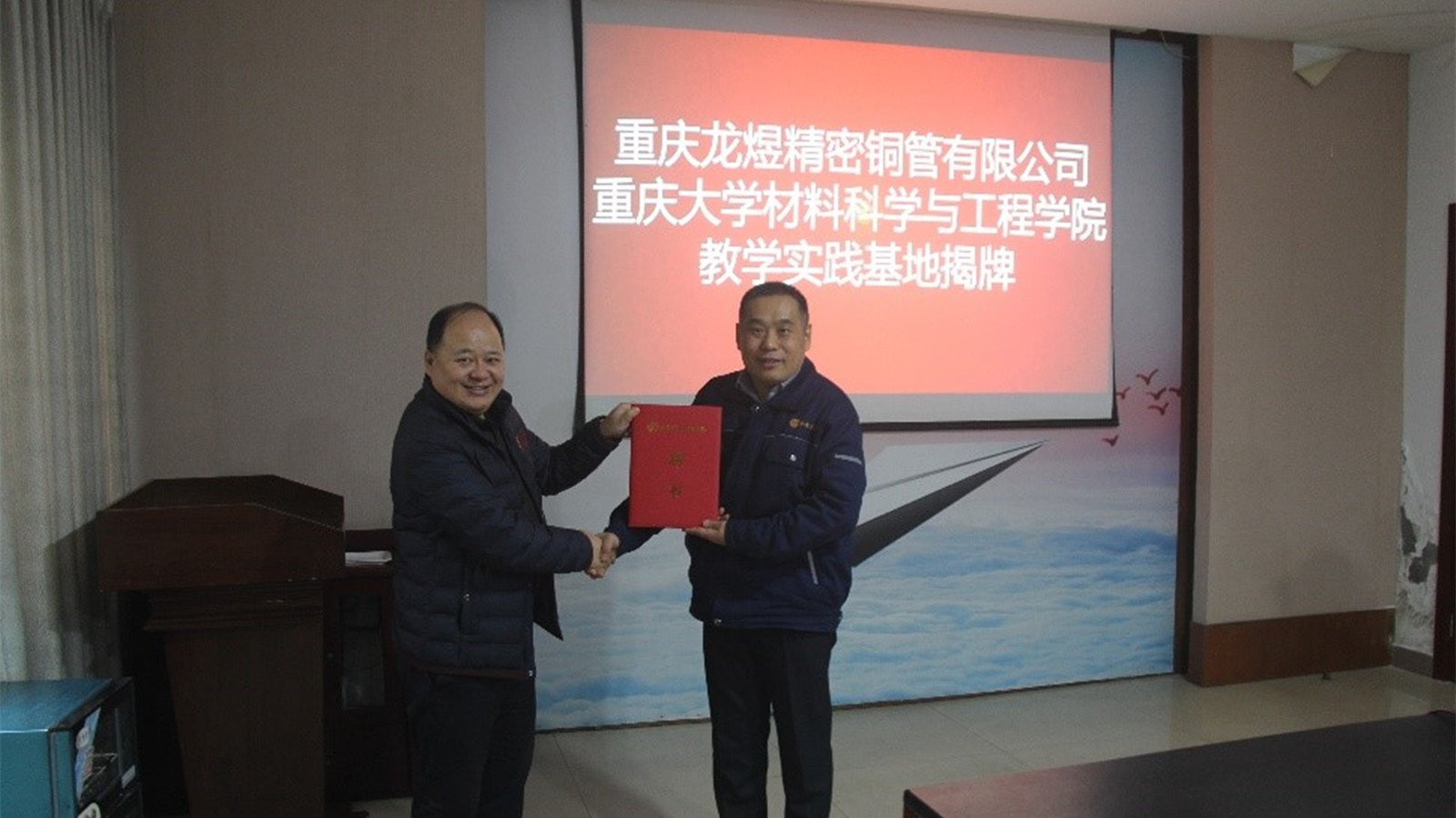 2021年12月9日,好博体育在金龙精密铜管集团重庆龙煜公司(以下称为龙煜铜管公司)举行了教学实践基地揭牌仪式,标志着公司教学实践基地再添新成员。揭牌仪式由龙煜铜管公司技术中心负责人常俊杰主持,公司总经理张旭辉、副总经理侯宝军、生产制造部经理李玉林等人员出席仪式。学院副经理陈泽军、加工系党支部书记袁新建和经理助理何维均参加了教学实践基地揭牌仪式。重庆市新材料产业联合会常务副会长兼秘书长王敬贵等见证了揭牌仪式。