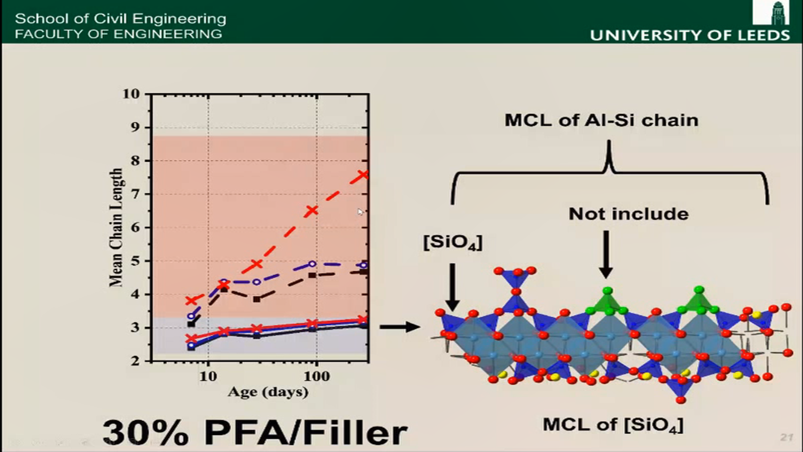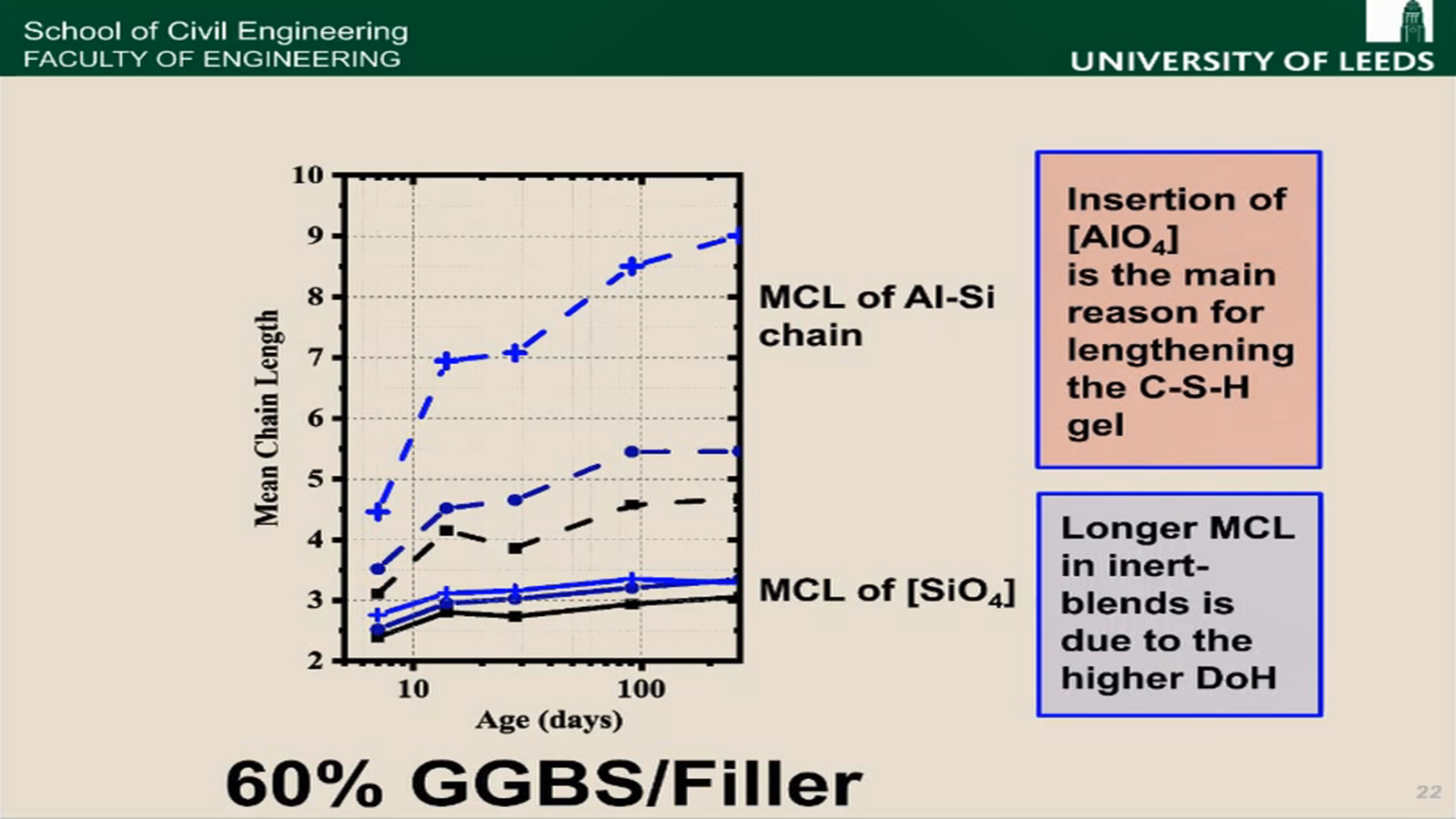 第二部分是辅助性胶凝材料对C-S-H凝胶的影响。朱效宏通过多种试验手段进行了研究,首先通过核磁共振观察Si的分布发现,掺入粉煤灰和矿渣后,C-(A)-S-H凝胶中的Al/Si比增加,Ca/(Si+Al)比降低,说明二次水化会使Al离子进入到C-S-H中;然后通过MNR和SOF研究了辅助性胶凝材料对C-S-H链长的影响,试验发现粉煤灰和矿渣对硅氧四面体的链长几乎没有影响,但是对Al-Si的总链长有显著增加,说明铝氧四面体在桥氧四面体位置的搭接或者取代是C-(A)-S-H链长增加的关键因素。最后通过透射电镜观察发现,矿渣对C-(A)-S-H中Al/Ca比的影响主要取决于矿渣的掺量,粉煤灰对C-(A)-S-H中Al/Ca比的影响主要取决于水化时间,但都存在Al/Ca比与Si/Ca比呈线性相关的规律。