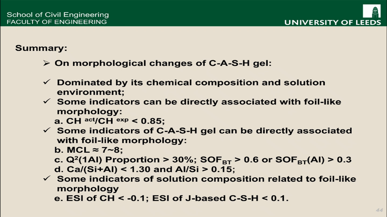 第三部分是辅助性胶凝材料对C-S-H凝胶的影响的关键因素。朱效宏从水化产物的组成成分、C-(A)-S-H凝胶的化学组成、C-(A)-S-H凝胶纳米尺度下的微观结构参数、饱和状态下的液相环境四个方面进行了讨论,并对一些关键参数的参考值进行了总结。