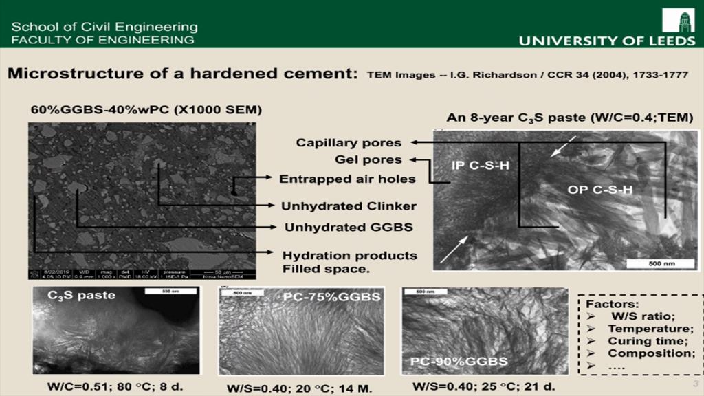 讲座开始,朱效宏介绍了水泥的主要的水化产物,包括C-S-H凝胶、氢氧化钙以及钙矾石等,并通过SEM和TEM图像向我们展示了水泥硬化后的微观结构,朱博士提出水泥水化产物的微观形貌非常重要,它对混凝土的渗透性、耐久性以及强度都有十分显著的影响,非常值得研究。并提出辅助胶凝材料会使水化产物的微观形貌发生转变。