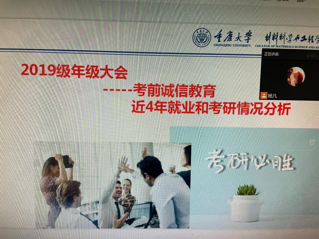 为了加强考前诚信教育、帮助同学们调整好考前心理状态以及做好员工考研就业动员,12月15日晚上21:30,好博体育本科2019级召开年级大会。鉴于疫情管控要求,本次年级大会采用腾讯会议的方式召开,由2019级辅导员杨凡老师主持。