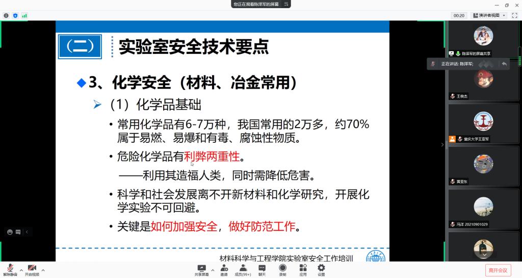 为进一步加强实验室安全教育,提高事故发生时的应急处理和自我保护能力,确保实验教学人身安全,使员工掌握实验室安全知识,消除实验室安全隐患。在全体新生签订《实验室安全承诺书》的基础上,好博体育于10月27日晚,使用腾讯会议平台召开了2021级研究生新生年级大会,大会邀请好博体育陈泽军副经理主讲题为“实验室安全教育”的主题讲座。全院约370名研究生新生参加专题报告。