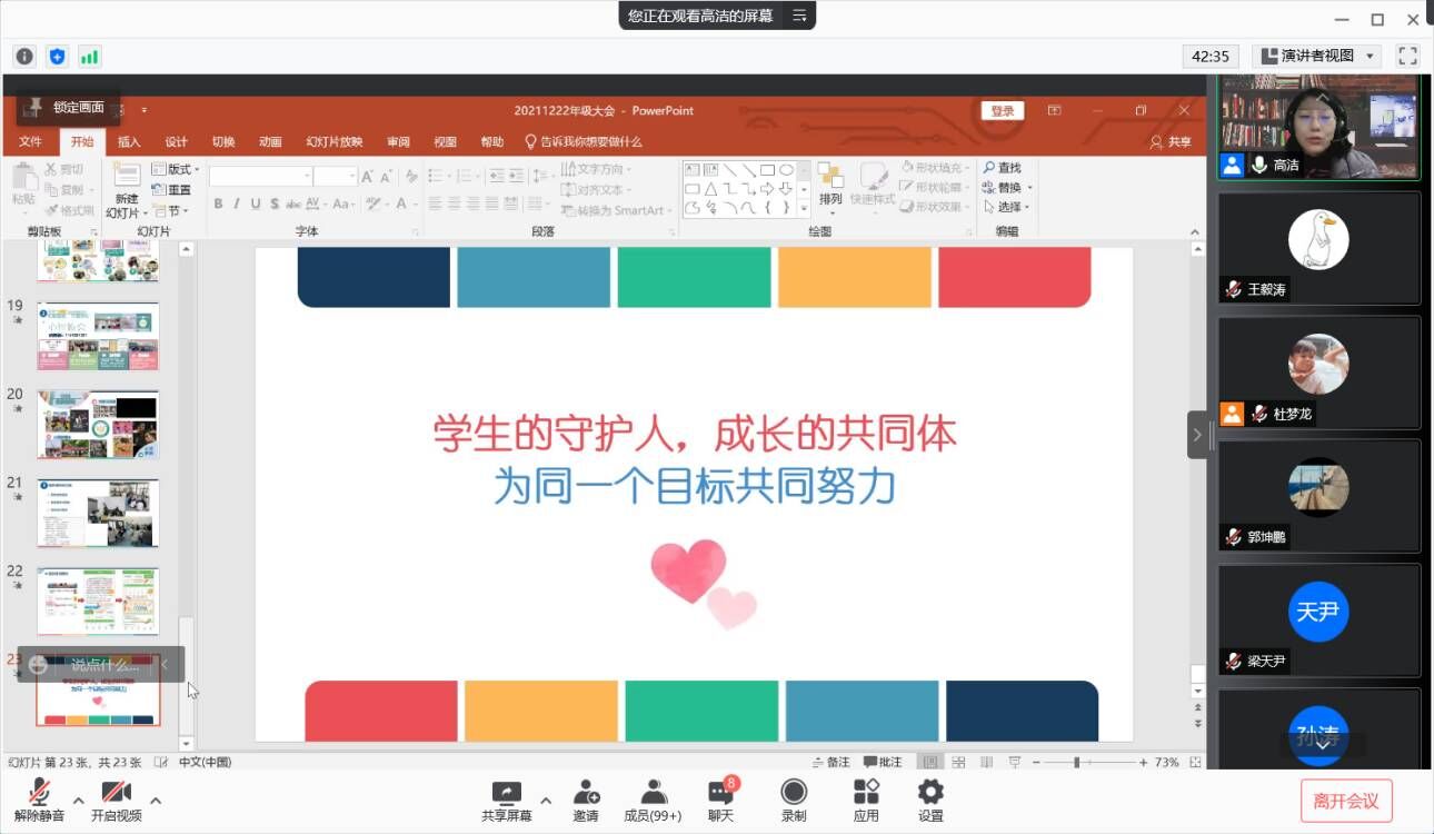 为加强岁末年初安全教育,12月22日(周三)晚19:30,年级辅导员高洁老师通过腾讯会议线上主持召开了研究生期末年级大会,2021级全体研究生参会。
