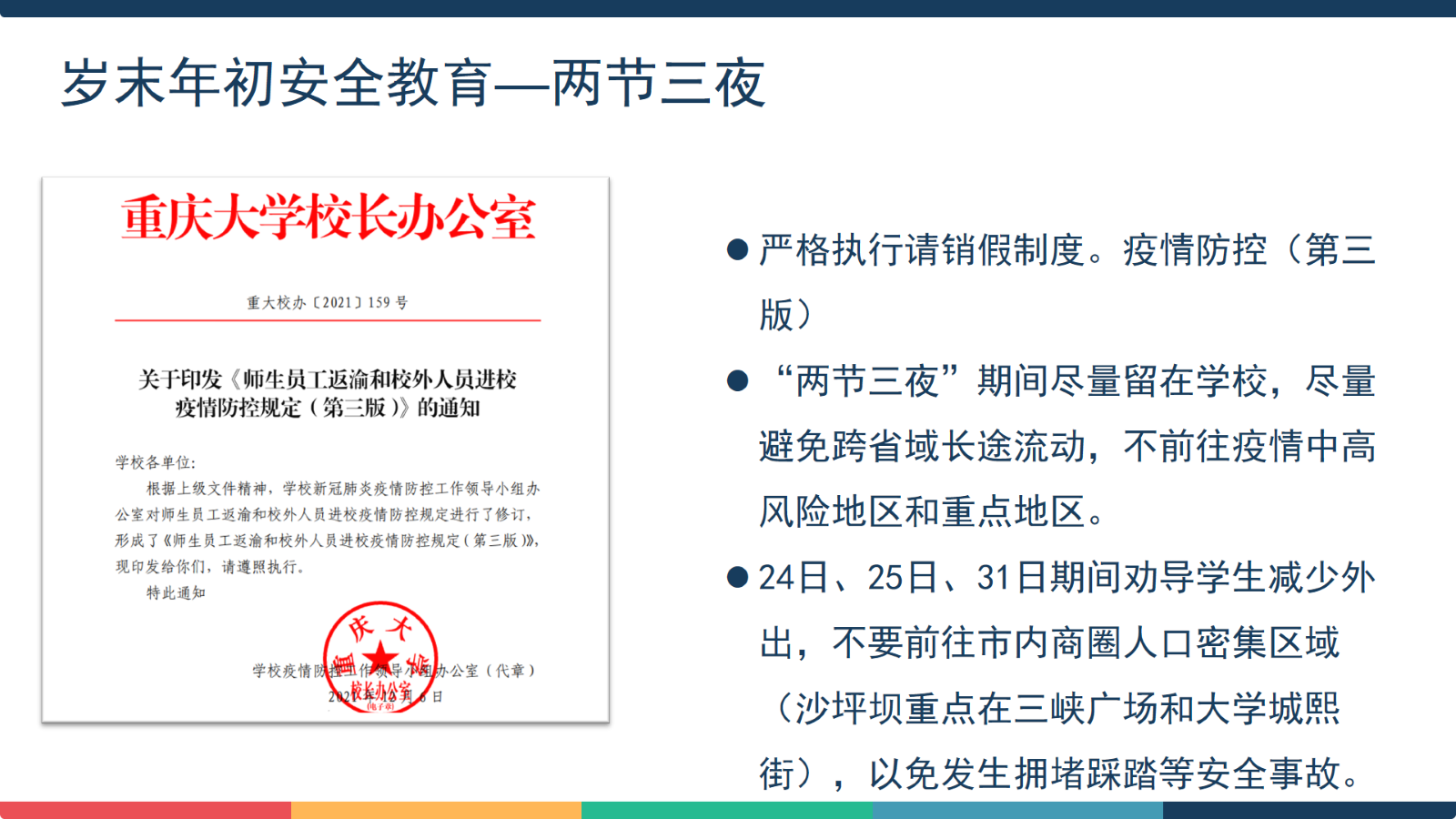 会议围绕三个方面展开:防疫与安全、反电诈教育以及心理普测结果沟通。临近年末和“两节三夜”重要时间节点,学院首先向同学们强调要遵守学校发布的最新疫情管控政策,严格执行请销假制度。坚持非必要不外出、不聚众、不前往疫情中高风险地区的原则,保护自己也保护他人。会议强调,在“两节三夜”期间应尽量留在校内,不前往市内商圈人口密集区域,以免发生拥堵踩踏等安全事故。