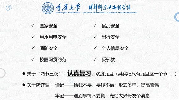 随后李大兴就国家安全、食品安全、用电安全、出行安全、消防安全、个人信息安全、校园网贷安全、反邪教等方面分别进行了详细的举例讲解,提醒同学们要主动关注、学习年级群和班级群中发布的《警情通报》电信诈骗案例,要了解诈骗的常用手段,不断提高警惕性,增强防诈骗意识。同时对于“两节三夜”期间的安全管理要求和加强传统文化的重视方面进行了强调,提倡同学们认真复习备考,遵守学校疫情防控工作相关规定,在校内以文明健康的方式欢度元旦。