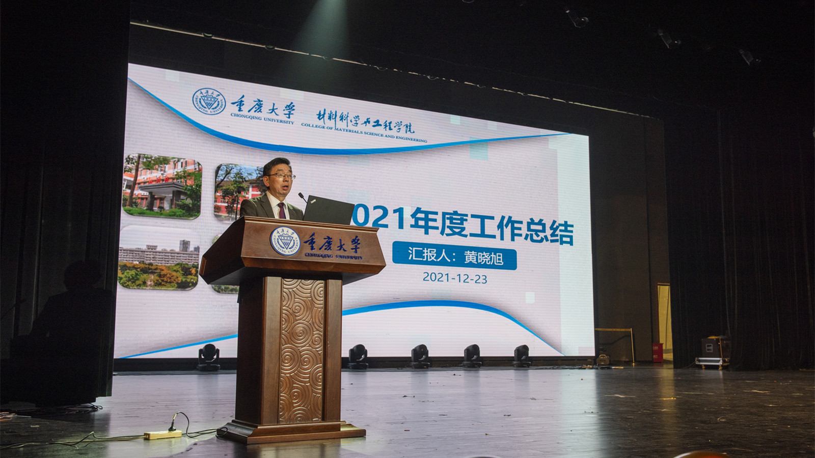 黄晓旭作2021年度工作总结报告。他介绍,在即将过去的一年中,学院积极推动学校“双一流”建设和“三全育人”综合改革,在党建思政、人才培养、学科发展、队伍建设、科学研究等方面都取得了丰硕的成果。获批重庆市首批新时代高公司党建“双创”标杆院系;团队队伍建设取得实效,全年新增国家级青年人才5人,引进教授、副教授、弘深青年教师等 14 人;克服疫情影响,广开渠道,保持科研经费持续增长,科研产出保持领跑,论文质量显著提升;期刊建设成效显著,《镁合金国际期刊JMA》影响因子IF 10.088,跃居全球同类期刊第一位,《Nano Materials Science 》被EI数据库收录;以公司为主的材料科学ESI排名稳步提升,11月进入全球前0.723‰,全球排名78位,较2020年同期提升11位。一切成绩的获得都离不开全院师生们的共同努力。