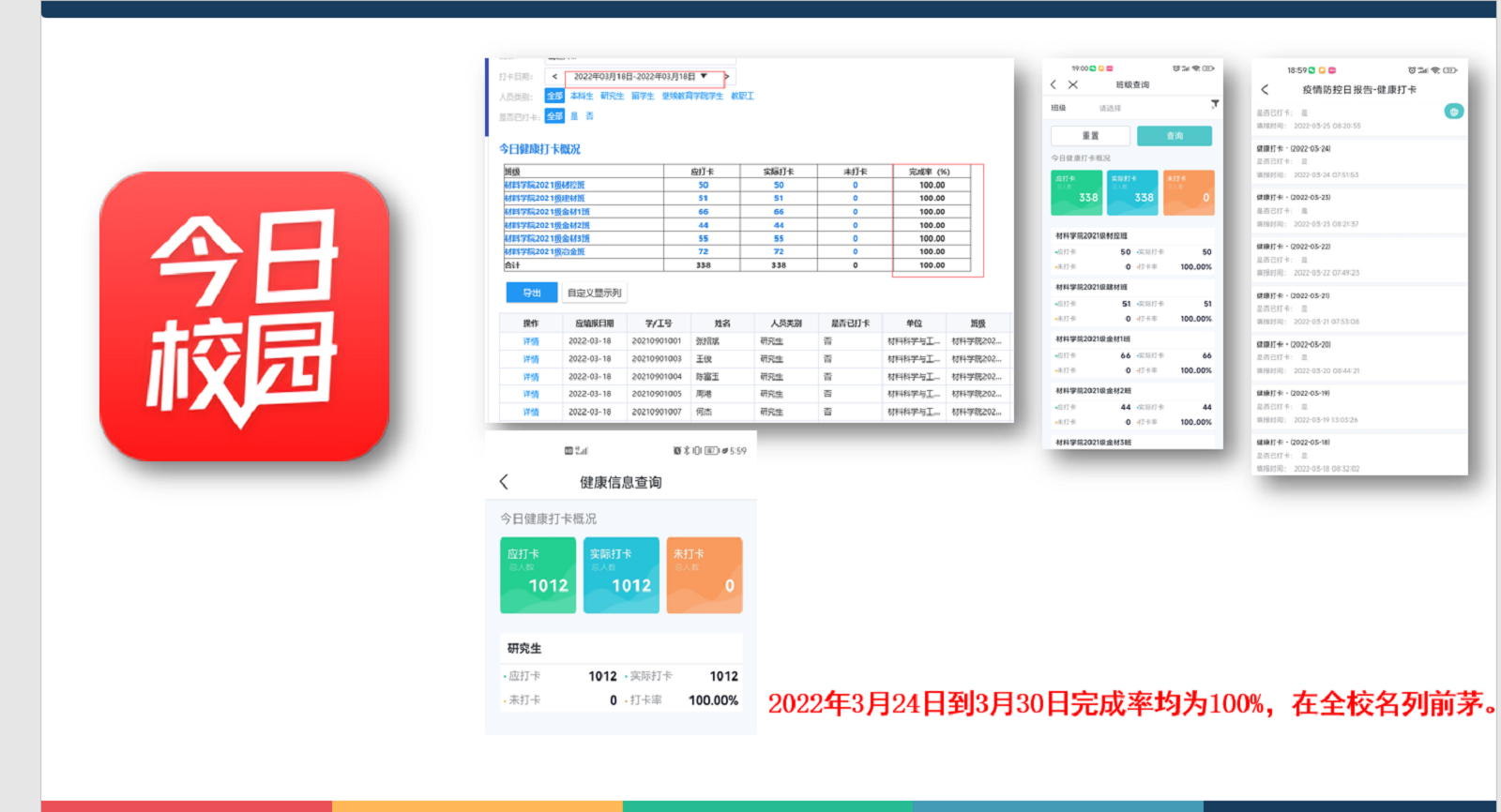 为做好疫情管控期间的人员动态信息搜集工作,本年级及时在“今日校园”app上进行每日打卡。自3月24日系统调试完毕正式全员打卡以来,2021级全体研究生338人积极配合学校相关工作,每天保持百分之百的打卡率,打卡率在全校名列前茅,学院对此向同学们提出鼓励。