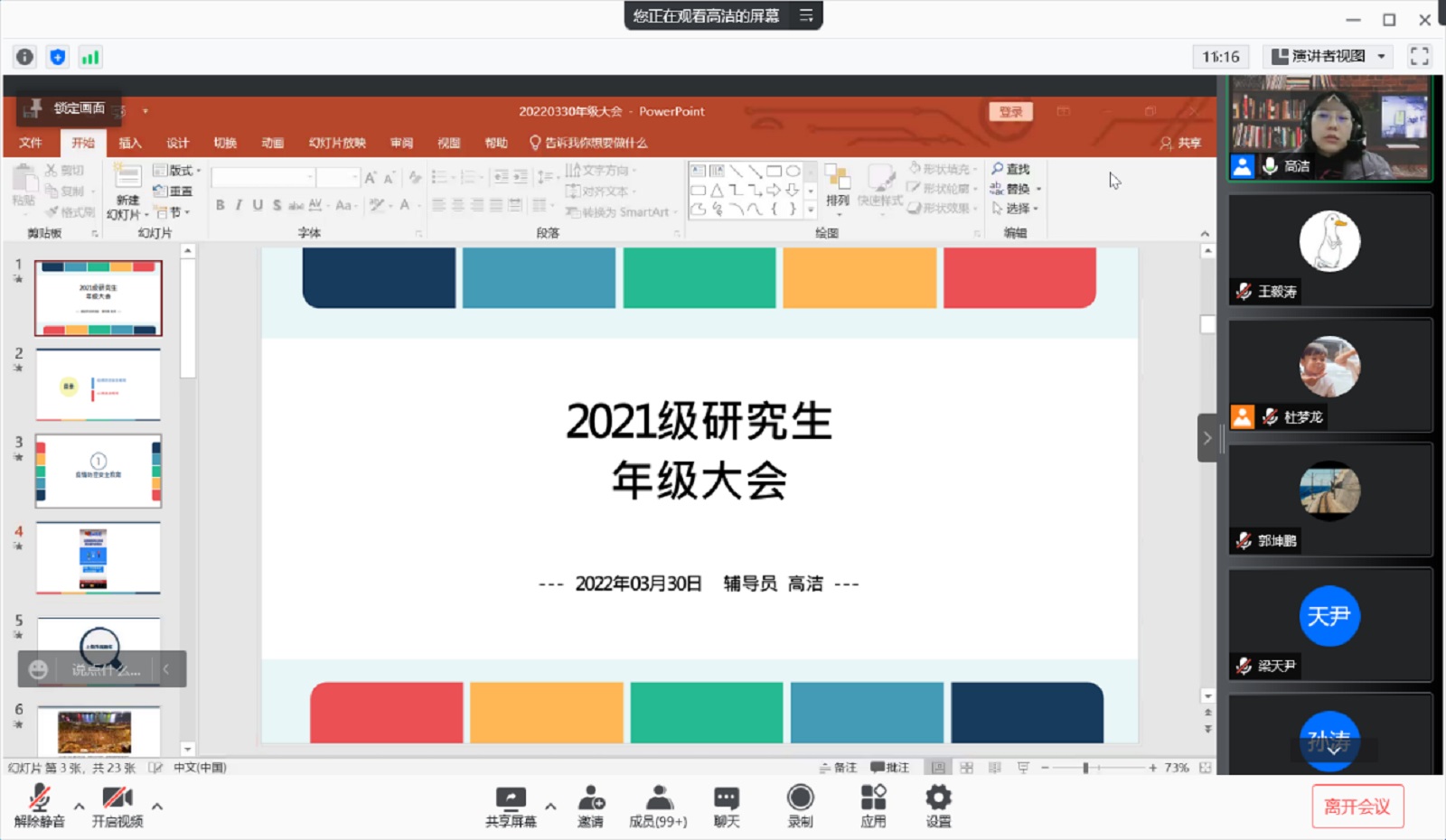 为加强疫情防控安全教育和心理健康常识宣讲,2022年3月30日晚19:30,年级辅导员高洁老师在腾讯会议上主持召开了2021级研究生春季学期年级大会,2021级全体研究生参会。