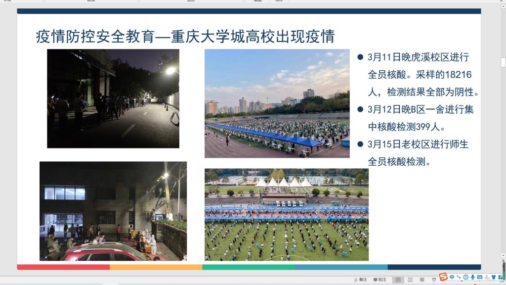 在辅导员带领下,年级员工一起学习了《师生员工返渝和校外人员进校疫情防控规定(第六版)》,辅导员通过其他省市学校员工违规案例的宣讲,重申疫情管控政策的严肃性,倡导同学们在清明节放假期间,尽量在渝在校,非特别必要不离渝,非必要不流动,减少不必要外出。