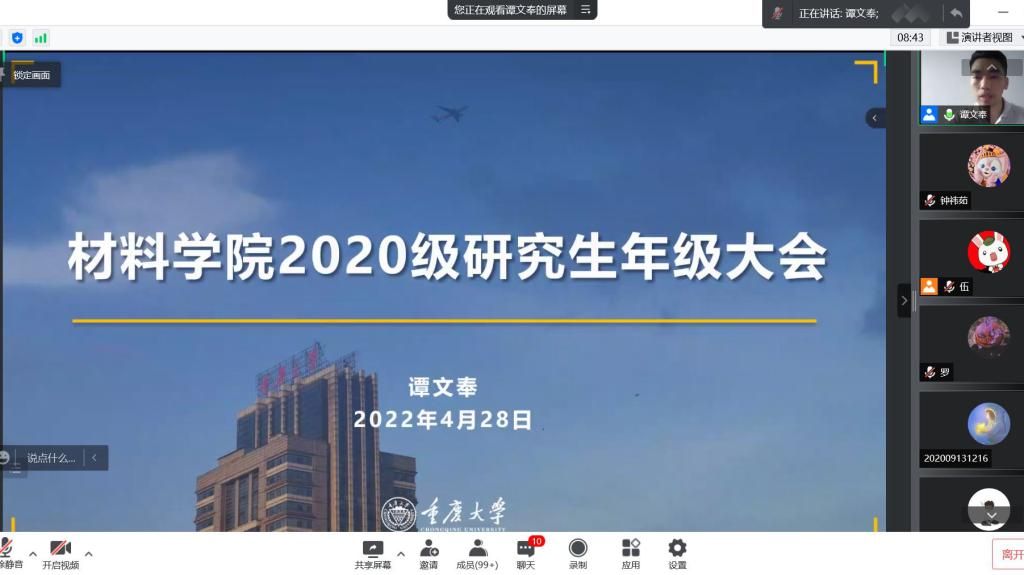 为提高同学安全意识,做好疫情防控,2020年4月28日19:00,好博体育2020级研究生于以线上会议形式召开年级大会,会议内容分为三个部分:安全教育、疫情防控和个人规划,本次大会由2020级研究生辅导员谭文奉主持,全体2020级研究生参加。