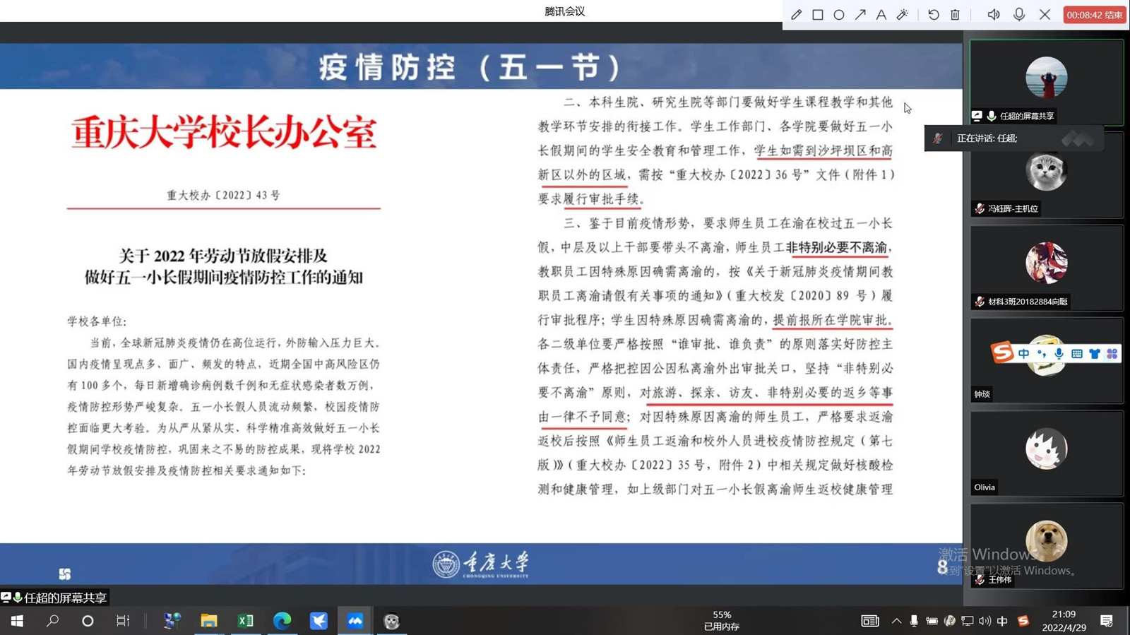 五一假期即将来临,为响应上级要求精准落实节日期间的安全教育与疫情防控工作,同时也是为毕业季的来临做好准备,2022年4月29日21:00,好博体育召开了2018级本科生线上年级大会。本次大会由辅导员任超主持,全体2018级本科生参加,会议内容分为四个部分:安全教育、疫情防控、毕业季活动安排和个人规划。