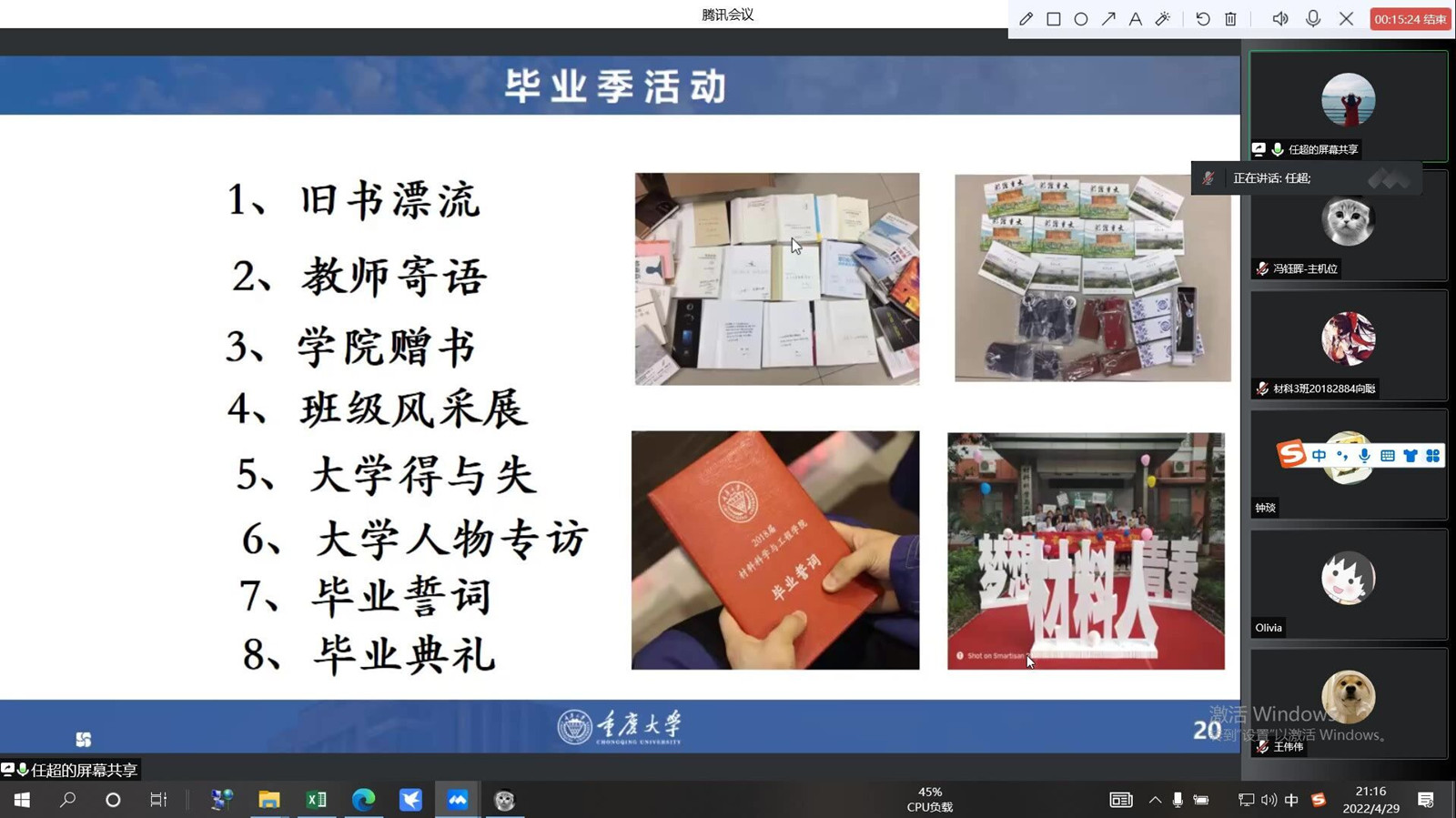 之后,任老师介绍了在毕业季期间的各种学院安排,诸如旧书漂流、教师寄语及班级风采展等活动,希望大家积极参加,为自己大学四年生活画上圆满的句号,留下美好的回忆。