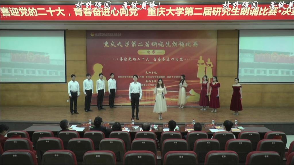 开篇队员们深情朗诵距今70多年前创作的校歌:“江汉思禹功,教化溯文翁。学府宏开,济济隆隆。”这是一首高唱爱国精神的歌,也是一首立足巴蜀,面向全国、放眼世界的歌。”中篇队员声情并茂讲述中国共产党的伟大建党精神:“建党佳节到,七月一日红。向着太阳我放声高歌,歌唱斧头、镰刀、五星。”从南湖红船到南昌的枪声,从神舟号遨游太空到嫦娥号巡视广寒宫,中国共产党巍巍百年征程画卷在时而情深意切,时而激情澎湃的朗诵节奏变换中徐徐展开。尾声张雨晨同学进行校歌领唱:“复兴民族兮,誓做前锋。” 重大青年的责任与担当跃然眼前,将全场气氛推向高潮。节目表演获得专业评委老师和师生观众的喜爱,赢得阵阵掌声。B站直播弹幕“材料强国,誓做前锋!”强势集发,铿锵有力,久久回响。