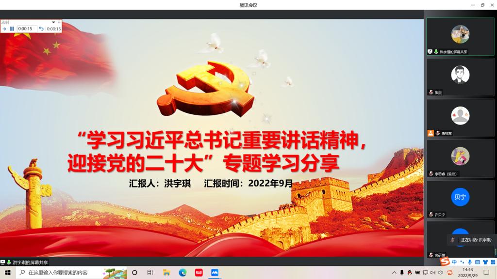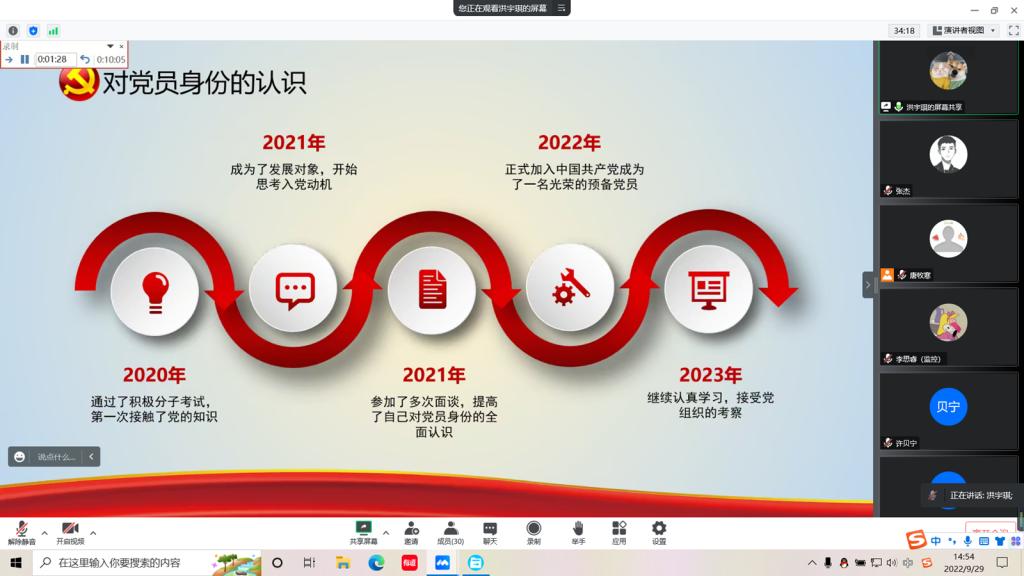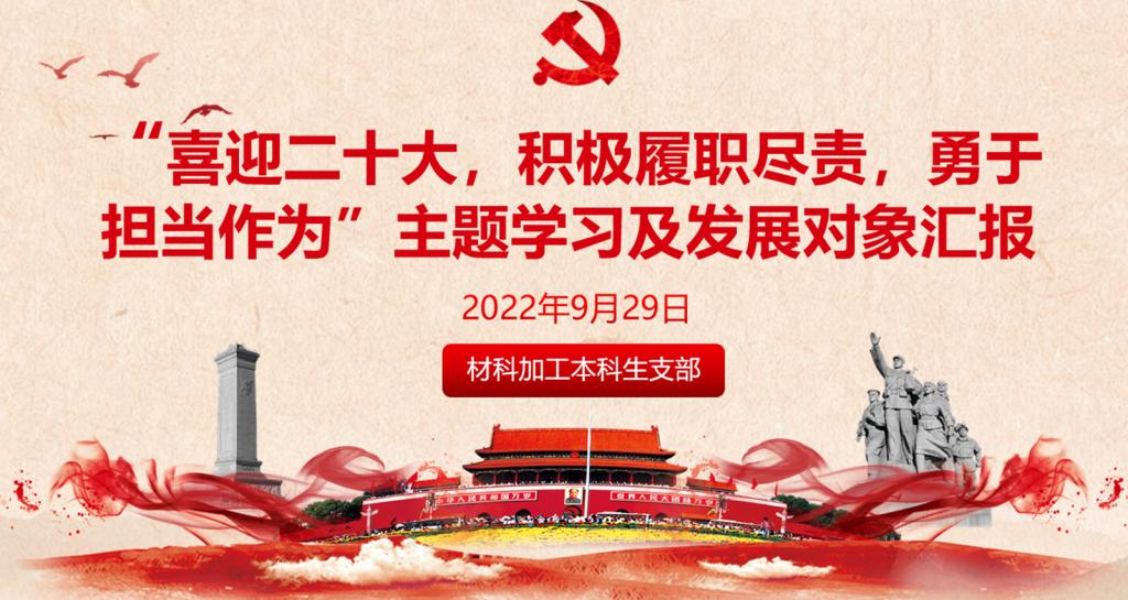 好博体育材科加工本科生党支部于2022年9月29日下午14:30准时召开网络线上腾讯会议,会议主题为“喜迎二十大,积极履职尽责,勇于担当作为”。八位预备党员就前期主题学习收获做了分享,就发展对象期间个人的成长和感悟做了汇报。支委唐牧寒同志主持会议,支部书记任超同志作总结。