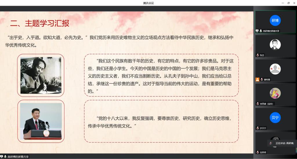 然后高研博同志做了分享。他结合自身入党后的思想转变,以及支部系列活动如红色宣讲和红色主题观影,谈到了对党员更深入的认识。此外,他还结合主题学习“出乎史,入其道。欲知大道,必先为史”,说到了党史学习的重要性,党和国家的发展要以史为鉴,汲取历史经验教训。