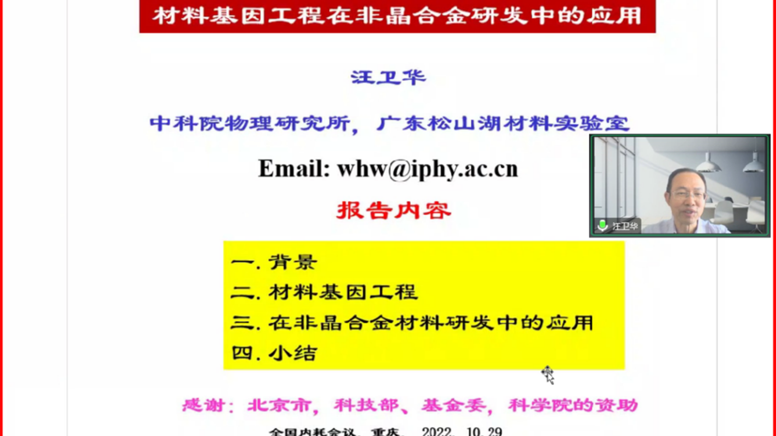 汪卫华院士在主旨报告中介绍了材料基因工程研究方法,分享了材料基因工程在非晶材料研发中的应用实例,分析了如何利用高通量的方法实现材料研究与选择效率大幅提高,最后还同参会专家讨论了内耗检测应用于高通量测试的重要性和可行性。