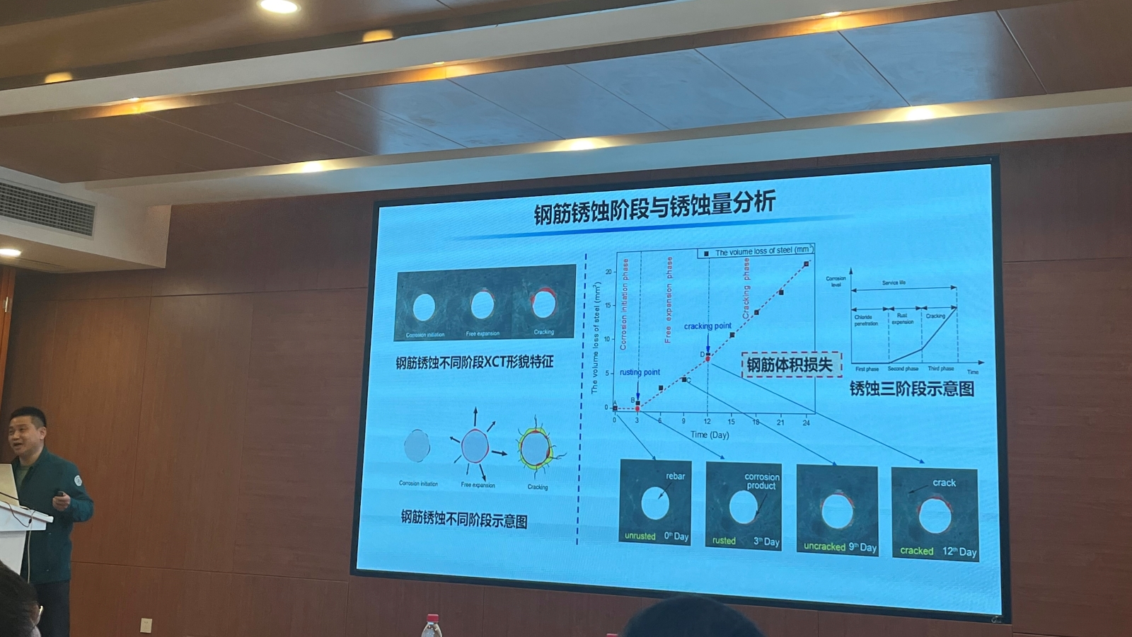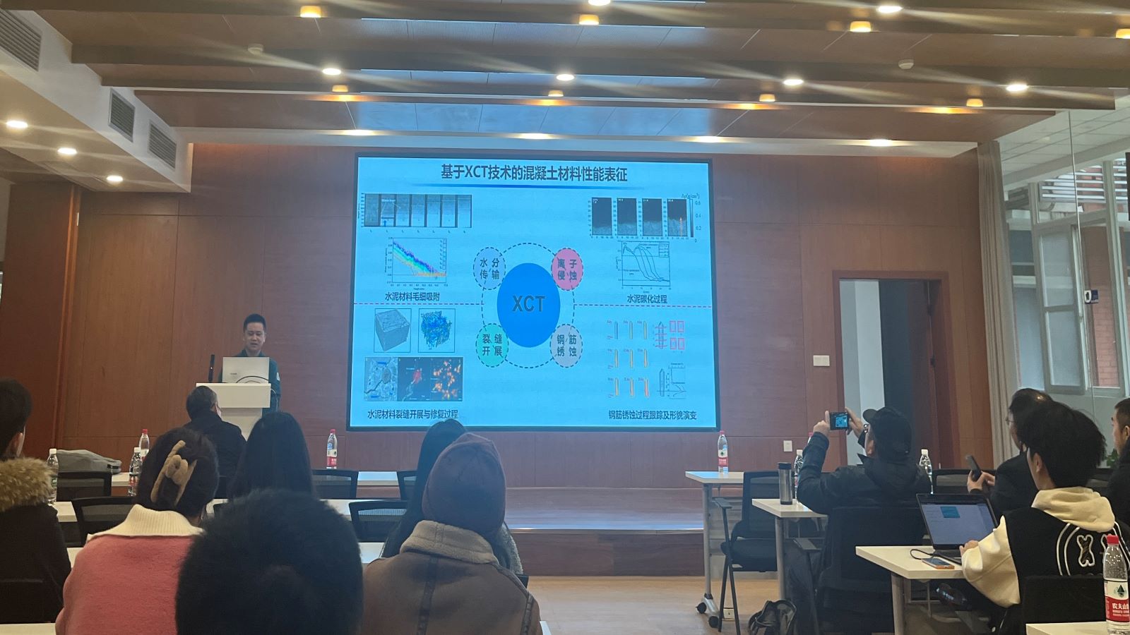 董必钦以“混凝土材料性能无损测试与定量分析——X射线计算机断层扫描(XCT)方法与应用”为题,从XCT技术能表征混凝土材料的水分传输、离子侵蚀、裂缝开展、钢筋锈蚀四个方面毛举缕析地向大家介绍了XCT技术在混凝土材料无损跟踪与量化分析方面的特色、基础原理及应用。