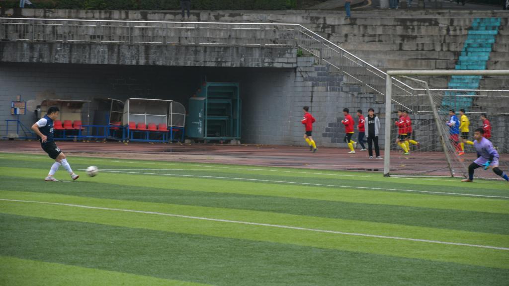 比赛进行到下半场50分钟,随着主裁的一声哨响,比赛常规时间结束,进入点球大战环节。首先开始点球的是生资队11号球员,助跑,打门!皮球打在了门柱上。接下来是材料点球回合,材料首球派出今天表现亮眼的18号,缓缓跑动,轻巧而精妙的射门,球进!全场欢呼!材料队18号球员在点球大战中,把比分改写为1:0。生资队派出21号球员,助跑,打门!皮球最终以刁钻的角度飞向底角,现场响起热烈掌声!比分1:1平。