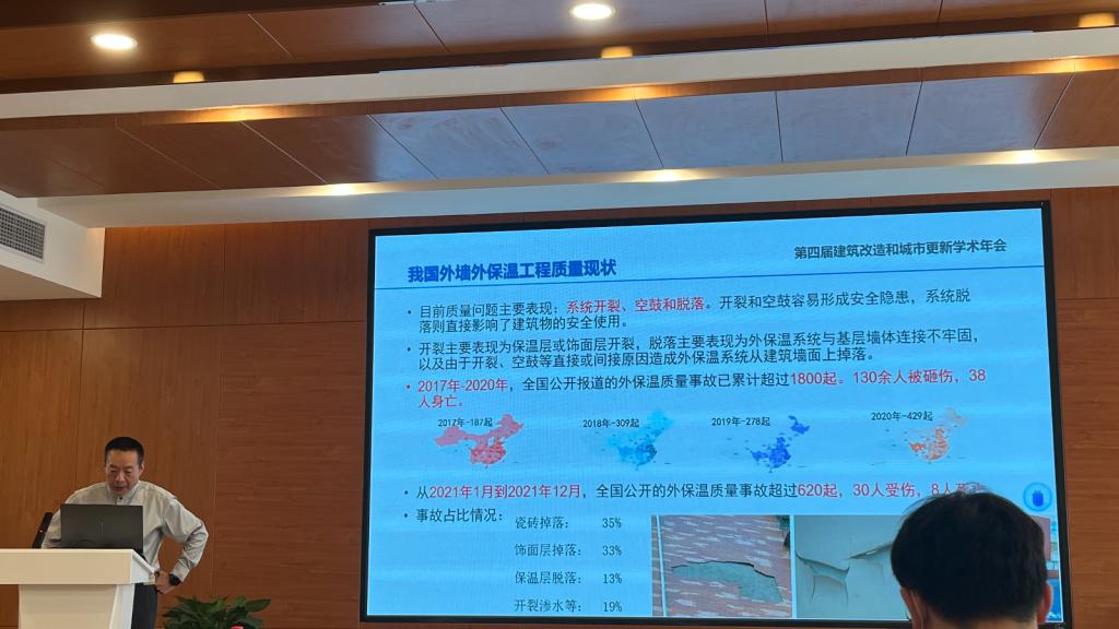 黄靖教授认为,建筑外围护系统是人类赖以遮风挡雨的第一道防线,是城市的“脸面”,但如今我国外墙外保温工程存在较大的问题,外墙的开裂、空鼓和脱落会形成严重的安全隐患。从2021年1月到2021年12月,全国公开报道的外保温质量事故超过620起,30人受伤,8人死亡。这些问题严重危害人民生命财产安全,影响城市建筑的健康和风貌,因此开发建筑围护系统数字化智能健康监测与防护修复关键技术形成整体解决方案势在必行,具有广阔的市场空间和应用前景。