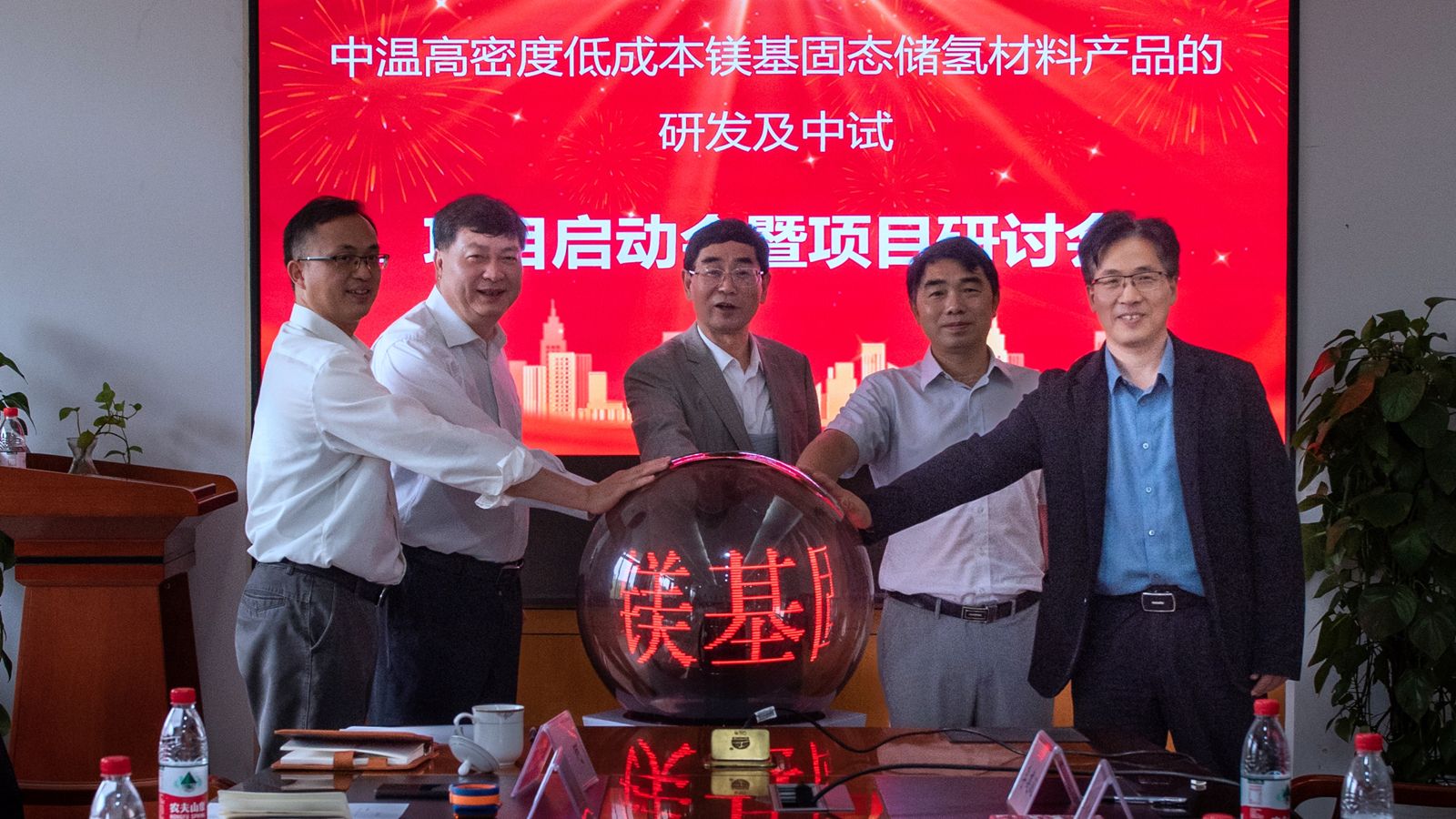 随后,卢义玉、潘复生、梅小明、王敬丰、唐伟能一同上前按住启动球,正式启动“中温高密度低成本镁基固态储氢材料产品研发及中试”项目。