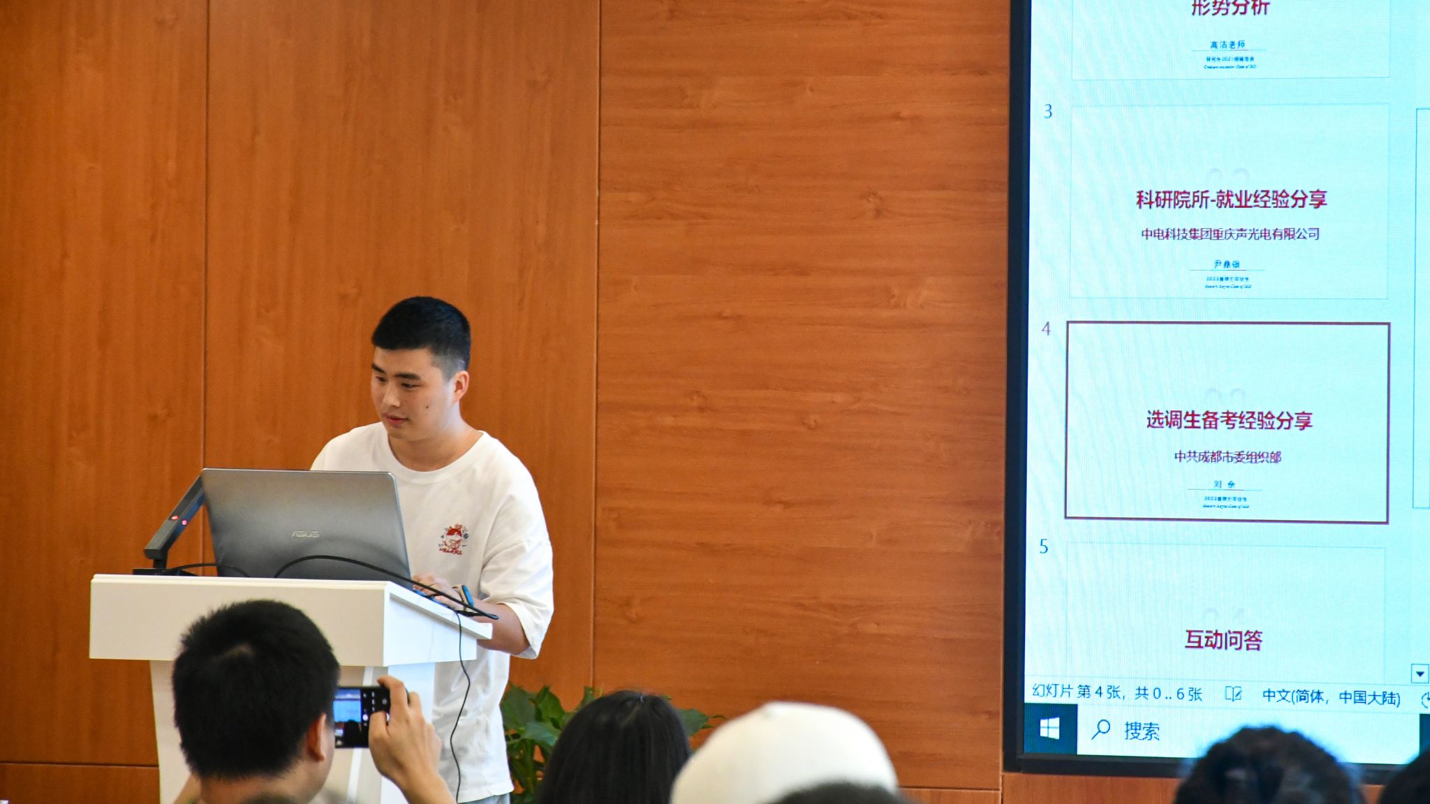 接着,刘余就四川省急需紧缺专业选调生备考经验进行分享。刘同学结合自身的备考过程从认识选调到积极备考等全方面细致的介绍了选调生备考流程。综合自己的备考实际给出了笔试面试的注意事项,提出同学们现在已经可以开始准备选调生考试,白天着重于自己的科研任务,晚上便可以开始刷课做题。最后刘同学也送给在场的同学一句诗来勉励大家“盛年不重来,一日难再晨。及时当勉励,岁月不待人。”