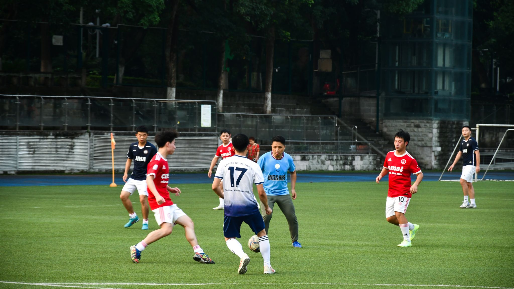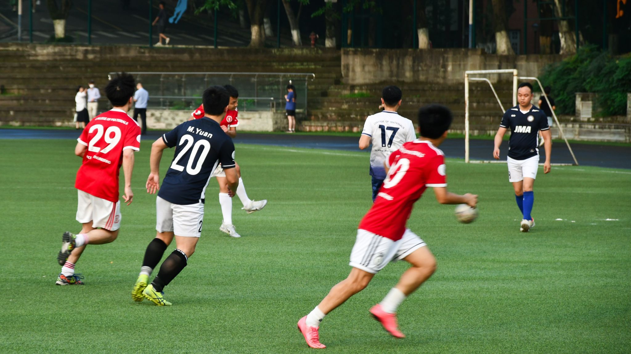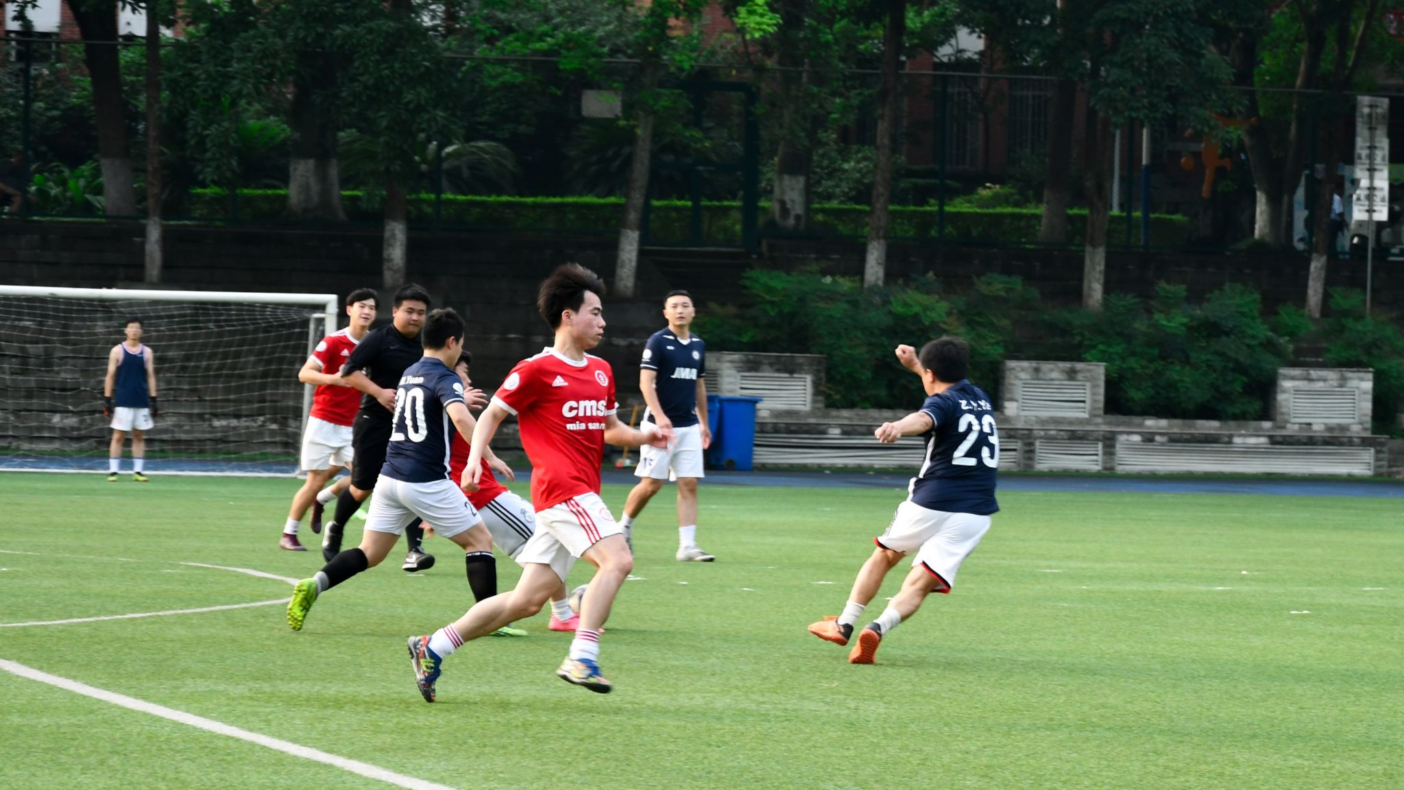 上半场即将结束,眼见比赛略显颓势,教工队5号球员以一记漂亮的射门重新燃起队员们的斗志,比分拉回到5:1。