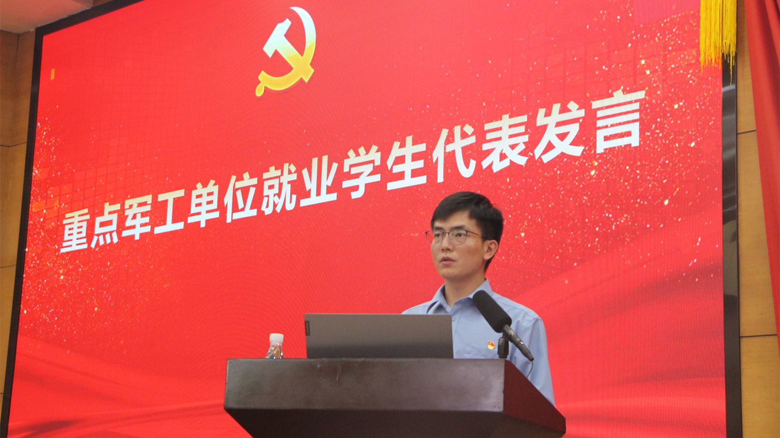 重点军工单位就业员工代表彭家国、联建单位就业员工代表胡瑞鑫分别发言,他们感谢母校的培养,立志扎根基层、扎根一线,让青春在为祖国、为人民、为民族、为人类的奉献中焕发出更加绚丽的光彩。