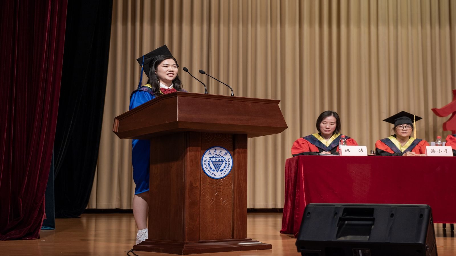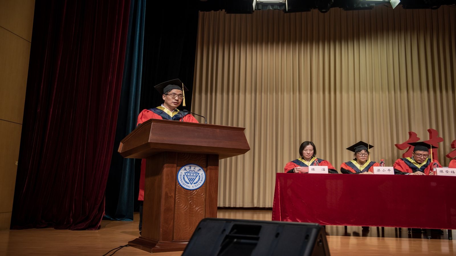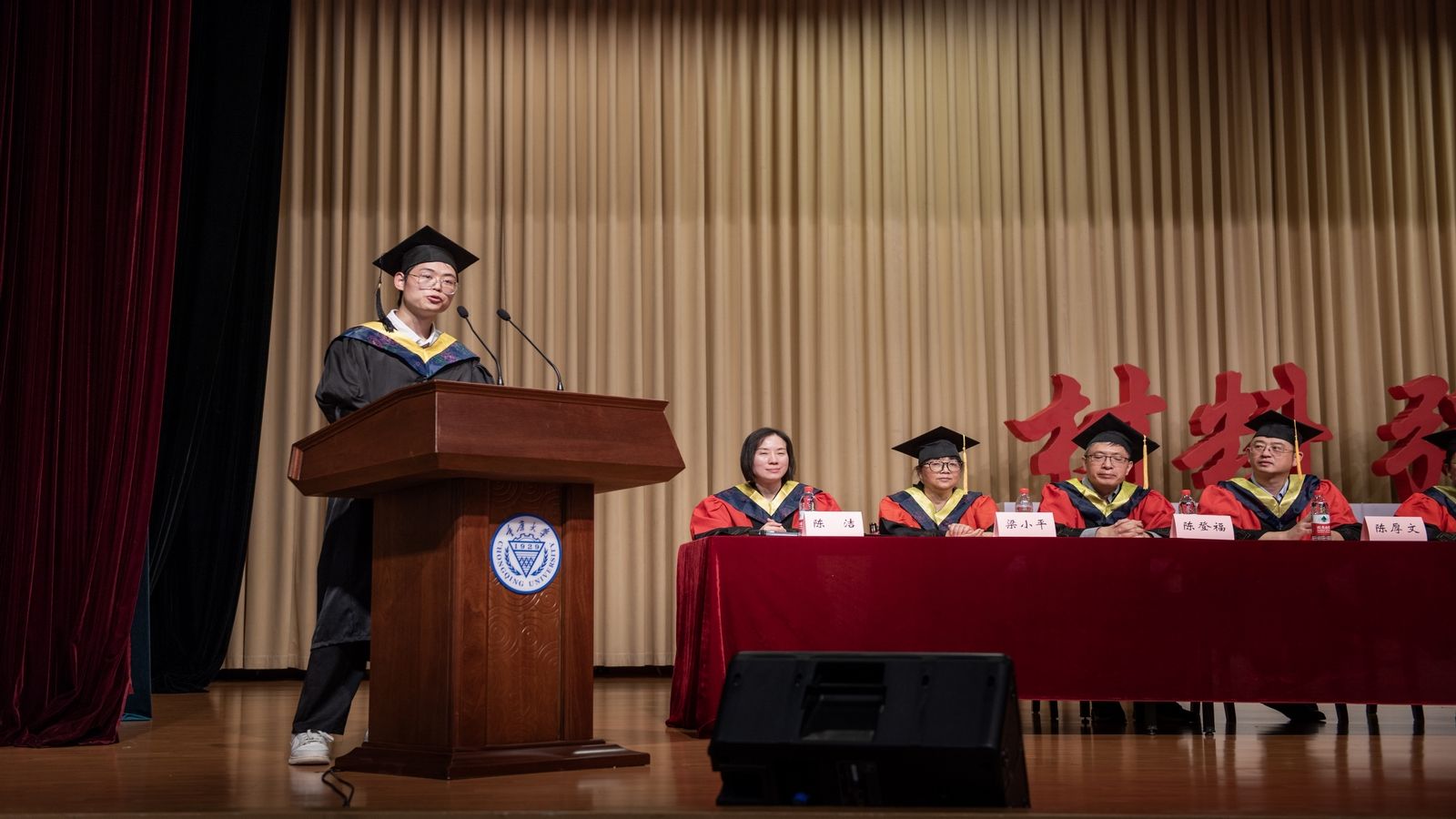2023届冉淞同学作为本科毕业生代表发言,他首先表达了对学院和老师的真挚感谢和对同学们的诚挚祝福。接着,他回顾了自己大学四年的学习生活,表达了即将告别母校的依依不舍。最后他代表同学们表达了未来努力奋斗、孜孜以求的坚定决心。