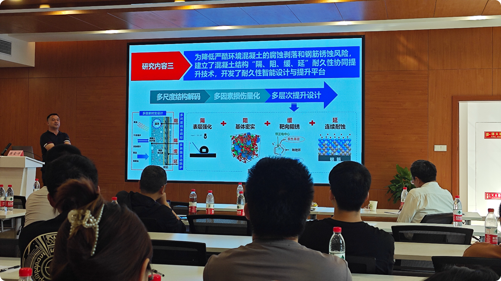 蒋金洋以“严酷环境混凝土耐久性设计提升与新材料应用探索”为题,从严酷条件下混凝土存在的问题出发,解码混凝土“基因”结构,量化混凝土微结构演变的关键参数,建立了混凝土多尺度力学和传输模型,为混凝土耐久性时变设计提供了关键输入参数,建立了混凝土结构耐久性协同提升技术,并将协同技术成功应用于实际工程。