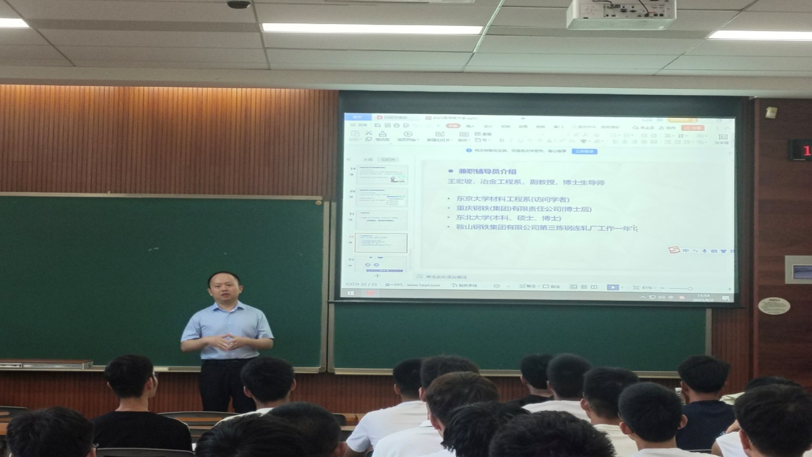 然后,王宏坡结合自己的亲身经历,给同学们在工作、专业学习和升学方面提出了诚恳的建议。他针对冶金工程专业的背景、特色和发展进行了详细的讲解,并以芯片制造和新能源汽车制造为例阐述了当前社会先进技术与冶金工程专业的联系;强调了专业知识的重要性,鼓励同学们要保持学习热情和好奇心,不断追求知识的深度和广度,勇于创新、积极探索,不断提升自己的专业能力,为未来的发展打下坚实的基础。同时,他还介绍了冶金工程专业的就业前景,鼓励同学们提前为自己的职业道路做好准备。
