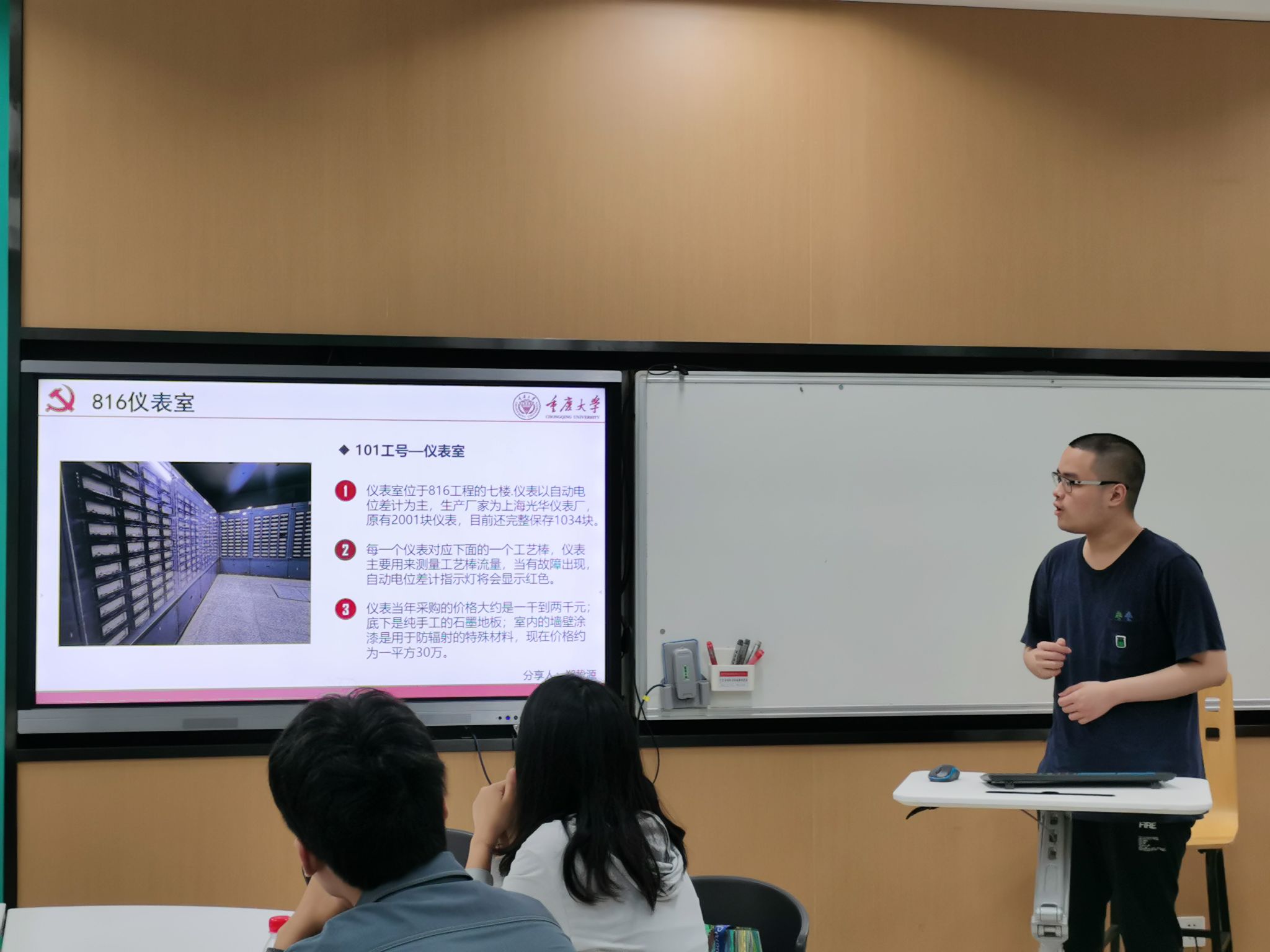 郑挚源同学分享的是位于816工程七楼的仪表室,仪表以自动电位差计为主,生产厂家为上海光华仪表厂,原有2001块仪表,目前还完整保存1034块。仪表当年采购的价格大约是一千到两千元;底下是纯手工的石墨地板;室内的墙壁涂漆是用于防辐射的特殊材料,现在价格约为一平方30万。