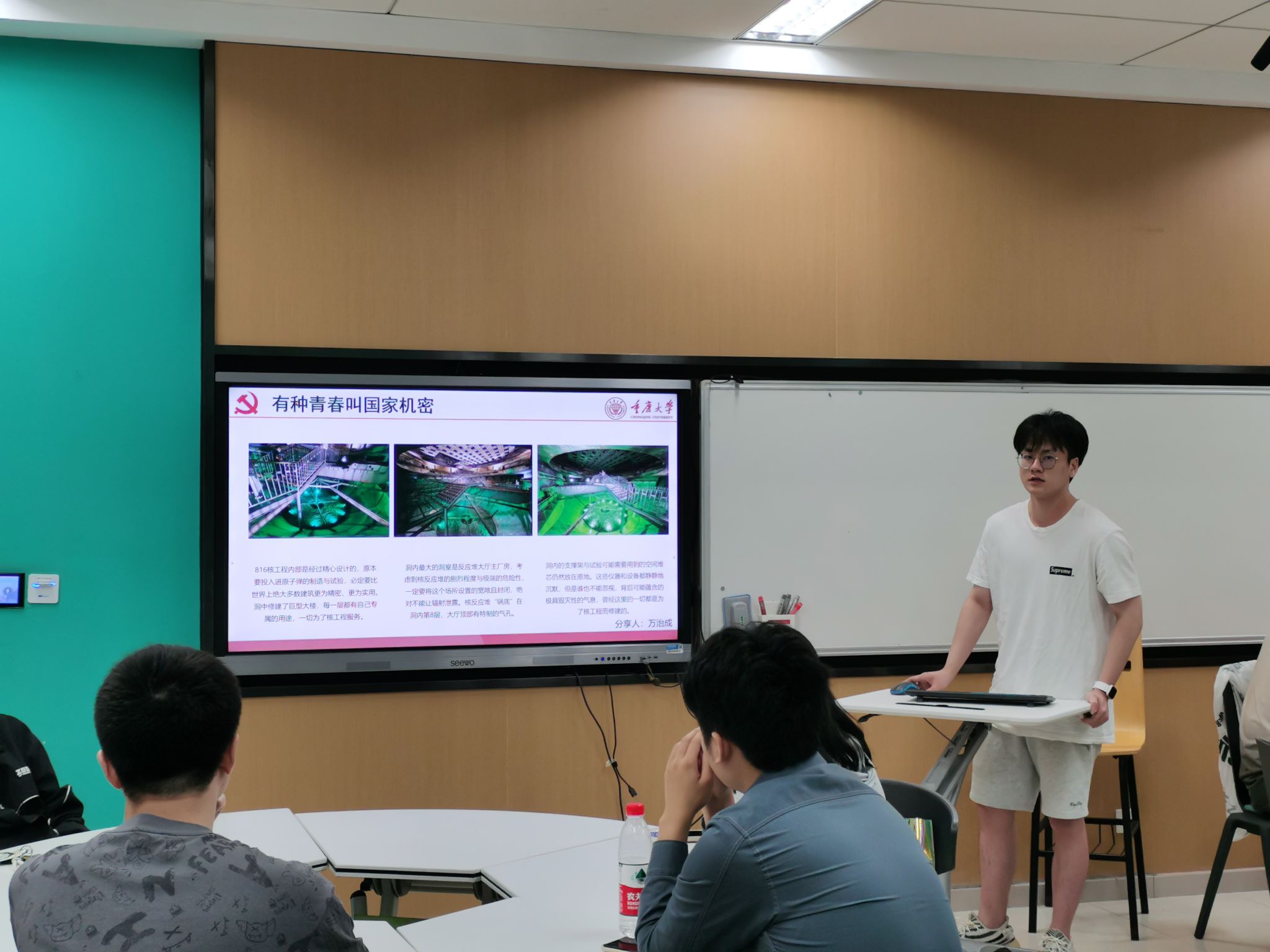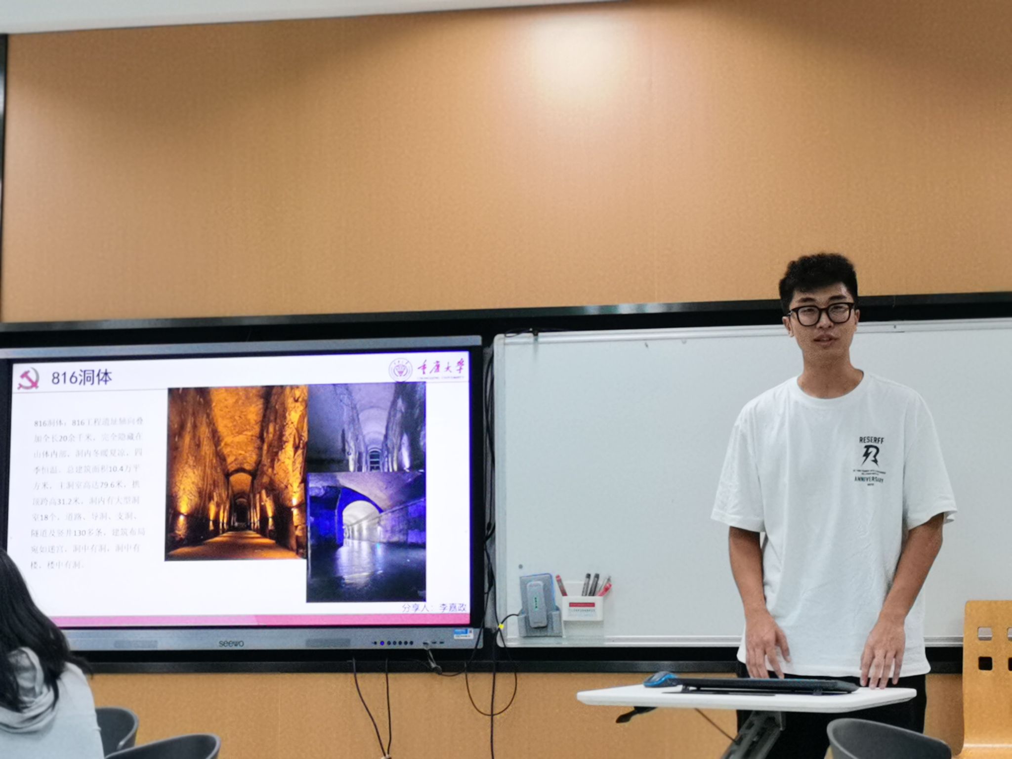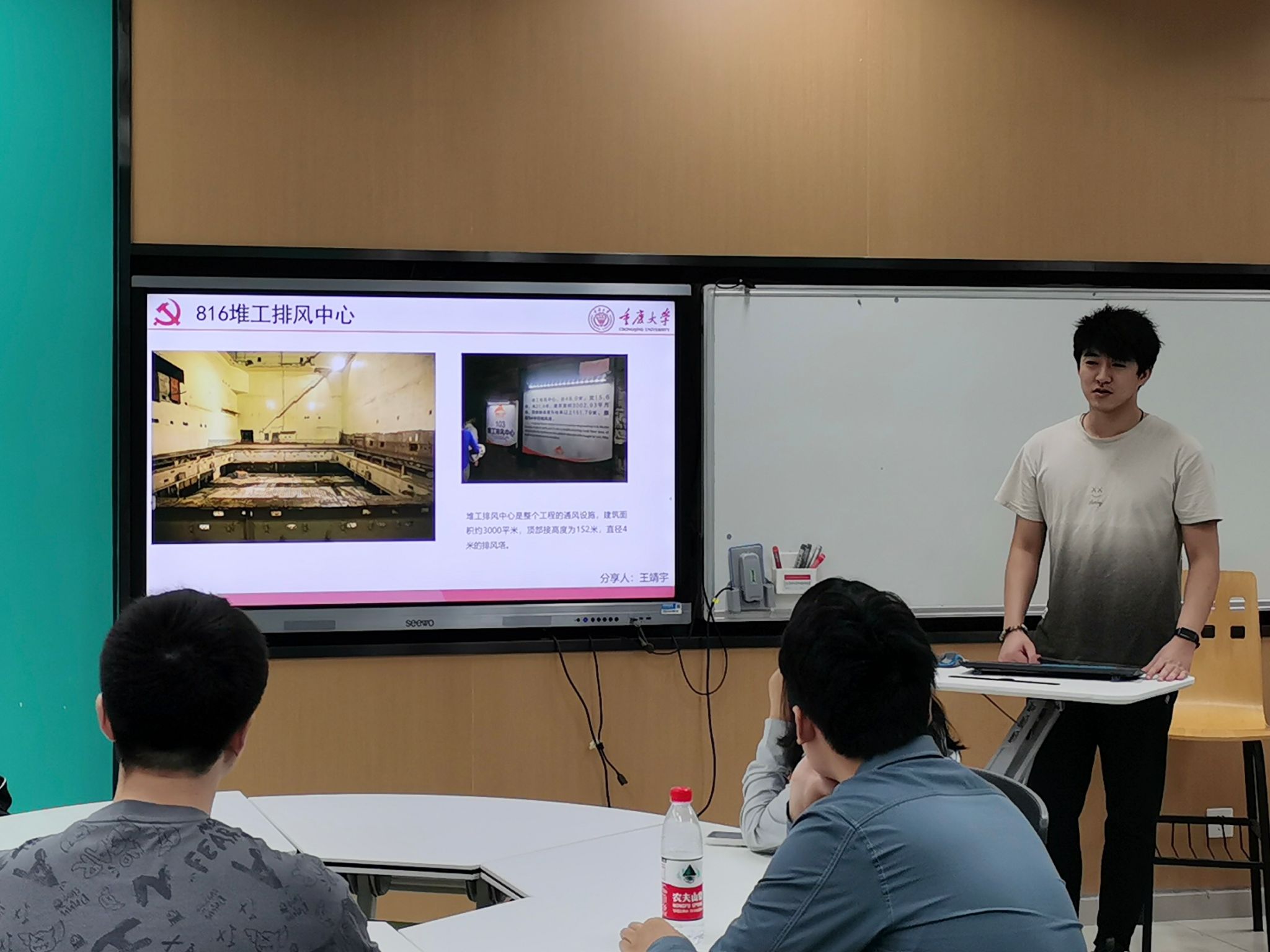 董孝杨和牟泫同学首先向支部同志们介绍了816核工程的建设背景,通过他们的讲述,我们仿佛也走进了当年那个核原料工业基地。参观当日,在涪陵区白涛镇乌江之畔,“816”地下核工程景区游人如织。白涛,从过去在地图上被抹去名字,到如今成为知名旅游地,“816”工程凝聚了太多人的青春和记忆。上世纪六十年代,为加强战备,国家决定将军事工业由东向西进行转移,建立战略大后方。经周总理批准,数万爱国青年从天南地北汇聚重庆,根据“靠山、分散、隐蔽”的原则,有关部门考察勘测了90多个地方,最终决定选址在涪陵白涛。其后历时18年挖空了金子山,挖出了这个已知的“世界最大人工洞体”。