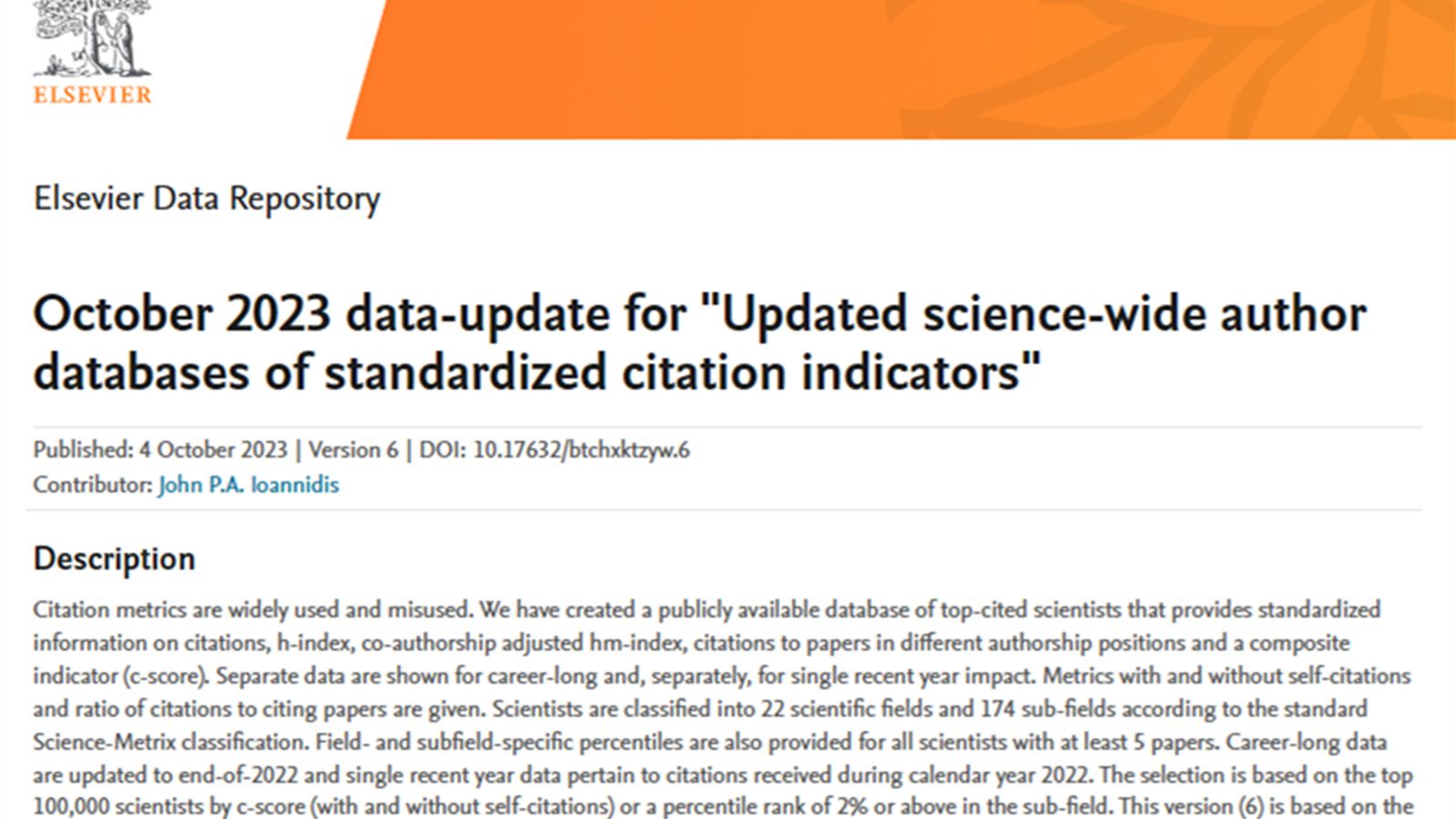榜单基于Scopus数据库,依照论文引用次数、h指数、hm指数、成果中作者排序位置等六种关键指标进行综合评估,从近700万科学家中筛选出世界排名前2%的科学家,数据包括了22个领域和174个子学科。数据综合衡量科学家的长期科研表现,既注重数量又注重质量,能更客观真实地反映学者的学术贡献度和影响力。