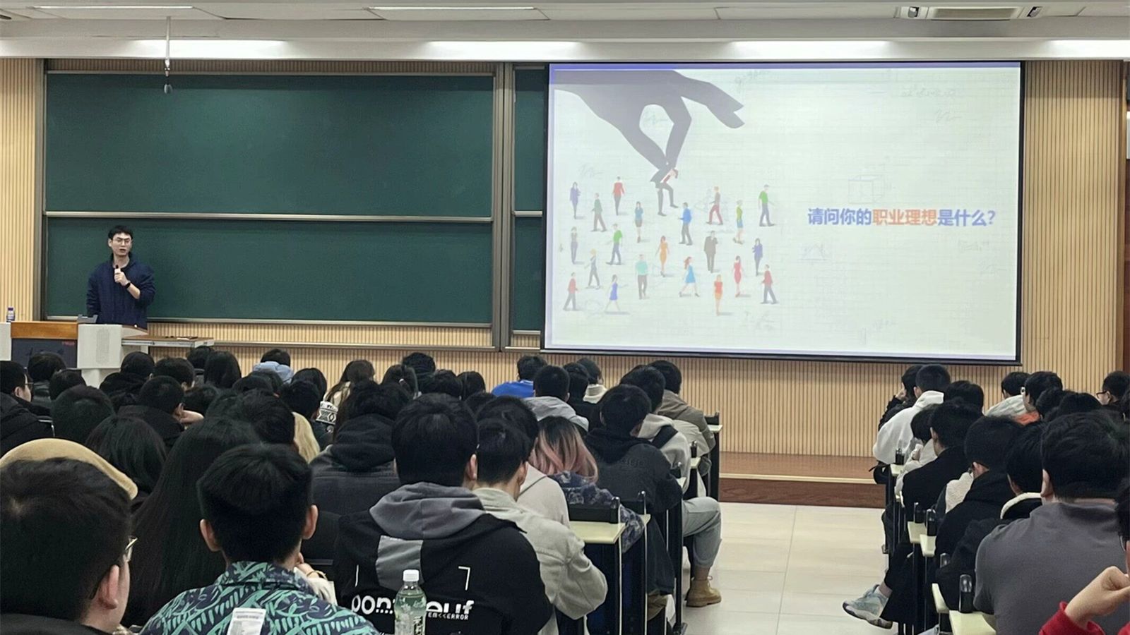 兼职辅导员姜涛以学校与学科的优势阐述了同学们就业的光明前景,并以美国斯坦福大学的择业十因素为参考,强调就业要紧贴个人情况抓主要因素、圈定职业范围。