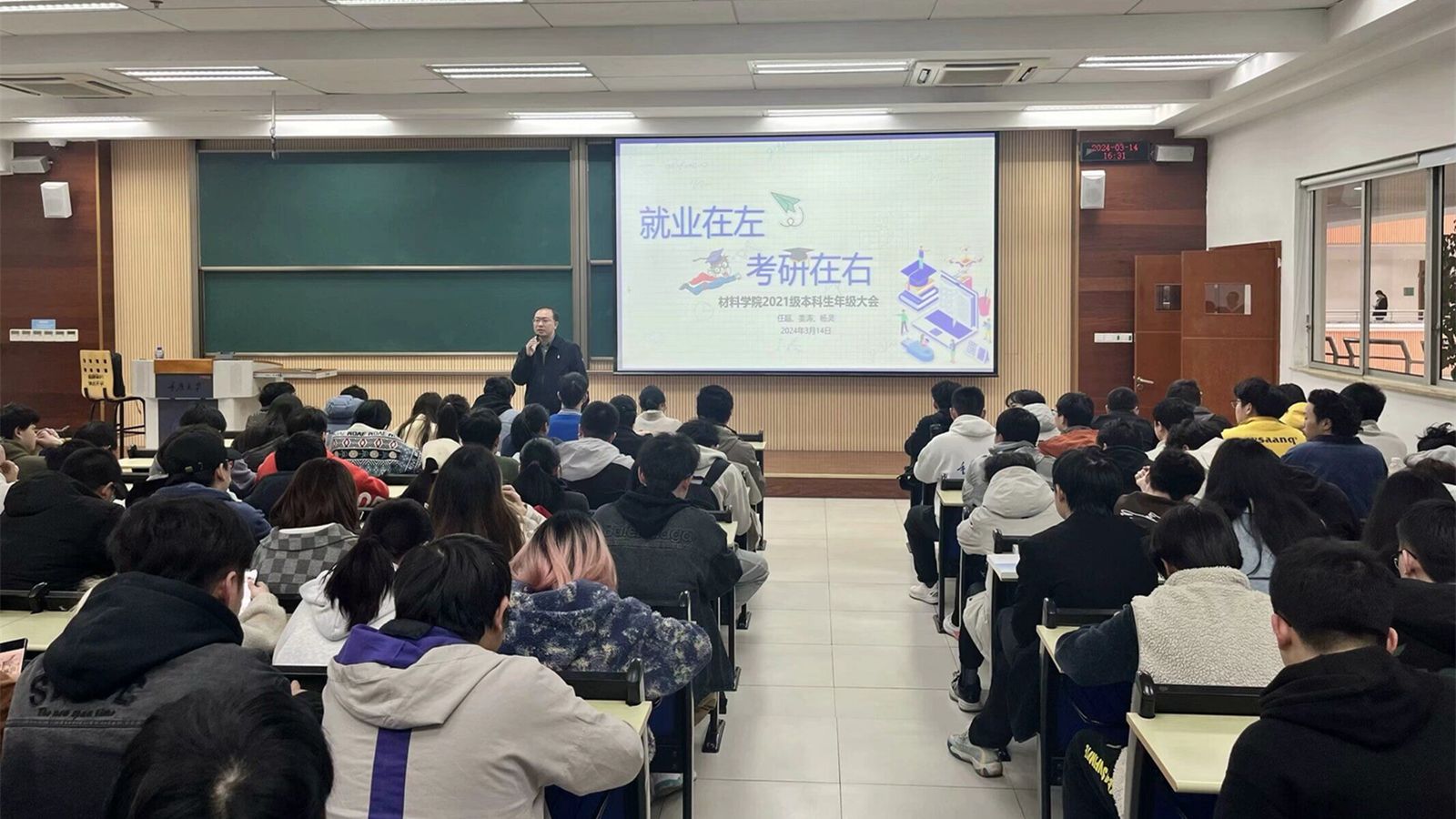 学期伊始,为进一步做好学院2021级本科生学业规划和思想引领工作,引导员工在大三下这一关键时期明确未来发展目标、激发员工的拼搏奋进热情。2024年3月14日下午,2021级本科生年级大会在B区第二综合楼318召开,本次会议以“就业在左,考研在右”为主题,由辅导员任超、兼职辅导员杨灵和姜涛共同主持。