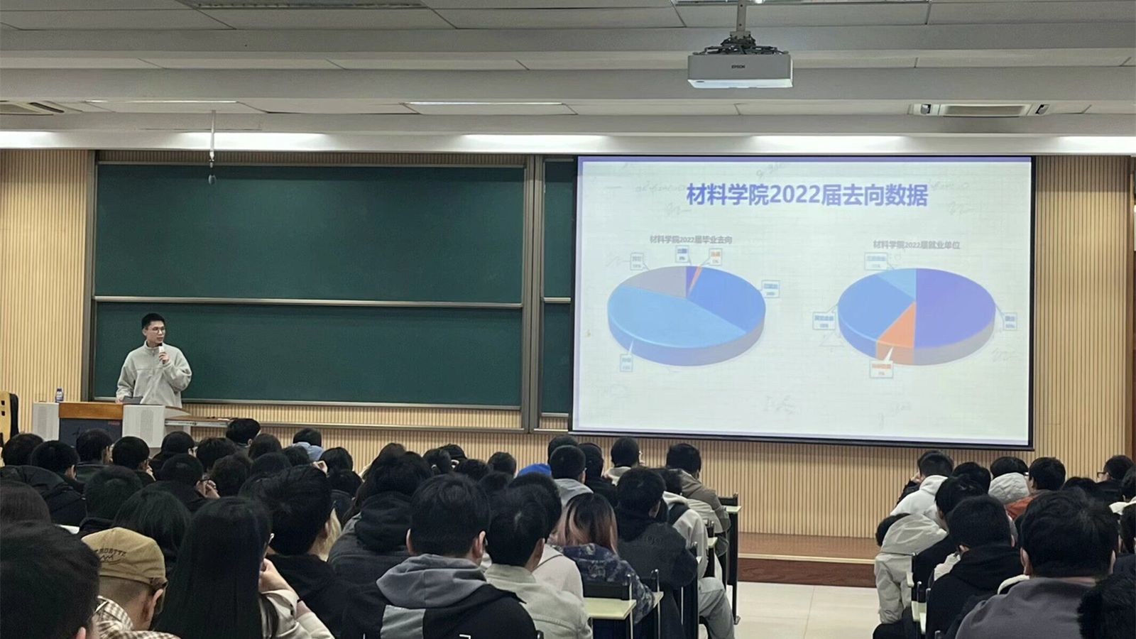 兼职辅导员杨灵就2022、2023届毕业生去向数据进行了全景式分析,强调现阶段的同学应当立足脚下,以学校课程规划为主,择业规划为辅,稳抓实干,一步一个脚印才能最终走向胜利。